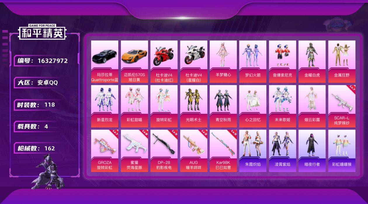 - [16198221]【特价出售/店主推荐】 安卓 微信-17粉装-4特效枪-4载具-6粉色飞行器-71994热力值-8王牌印记-146套装-174枪皮 【热门品类】:粉装-梦幻火箭,粉装-缤纷油彩 【粉色套装】:粉装-宝贝奶油派,粉装-天使彩虹糖,粉装-梦幻火箭,粉装-缤纷油彩,粉装-甜蜜誓约,粉装-苍蓝魅影,粉装-冰霜白皇,粉装-炙焰红王,粉装-王牌四分卫,粉装-星之彼岸,粉装-相思残雪,粉装-馨动时刻,粉装-暗夜玫瑰,粉装-林间仙鹿,粉装-彩虹鹿灵,粉装-山涧鹿灵,角色-异瞳寒姬 【粉色枪皮等级】:M416-风花雪月(七级),AUG-星之彼岸(五级),Kar98K-巳巳如意(一级),SLR-暗夜玫瑰(五级) 【粉色载具】:特斯拉Roadster(水滴蓝),特斯拉Roadster(沁心粉),特斯拉Cybertruck(极昼黑),空客H135-蔚蓝之翼,快艇-塞莎KL27(霓虹粉) 【粉色枪皮】:M416-风花雪月,AUG-星之彼岸,Kar98K-巳巳如意,SLR-暗夜玫瑰 【粉色飞行器】:梦幻火箭飞行器,甜蜜誓约飞行器,激战未来飞行器,绮梦青鸾飞行器,星之彼岸飞行器 【粉色降落伞】:甜心宝贝降落伞,梦幻火箭降落伞,甜蜜誓约降落伞,香水柠檬降落伞,暗翼战神降落伞,王牌四分卫降落伞,星之彼岸降落伞,相思残雪降落伞,怪笑疯兔降落伞,葫芦兄弟降落伞,暗夜玫瑰降落伞,林间仙鹿降落伞,海渊国主降落伞,蓝莓炮弹降落伞,炫光之旅降落伞,冷漠罗丽降落伞,炫彩糖果降落伞 【稀有套装】:套装-糖糖葫芦,套装-青团波波,套装-棉花软糖,角色-都市丽猫,套装-燕燕于飞,套装-鱼渊荷华,套装-霓虹热舞,套装-彩虹兔,套装-云朵鹅,套装-雪绒豹,套装-朱霞炽焰,套装-凌霄紫焰,套装-琴音绮想,套装-炫彩糖果 【稀有枪皮】:AKM-彩虹符号,AKM-星之彼岸,AKM-缤纷海域,AKM-萌趣颜团子,AKM-虎虎生威,AKM-龙的传人,M16A4-幻世战舞者,M16A4-甜心亚梦,SCAR-L-夏日绵绵冰,SCAR-L-暗夜玫瑰,SCAR-L-炫彩节奏,SCAR-L-玉兔迎春,SCAR-L-王牌四分卫,SCAR-L-甜蜜誓约,SCAR-L-碧影闪光,GROZA-异彩先驱,GROZA-彩虹符号,GROZA-林间仙鹿,GROZA-治愈之星,AUG-青春冒险家,QBZ-彩虹符号,QBZ-洛神天依,QBZ-电玩视界,QBZ-