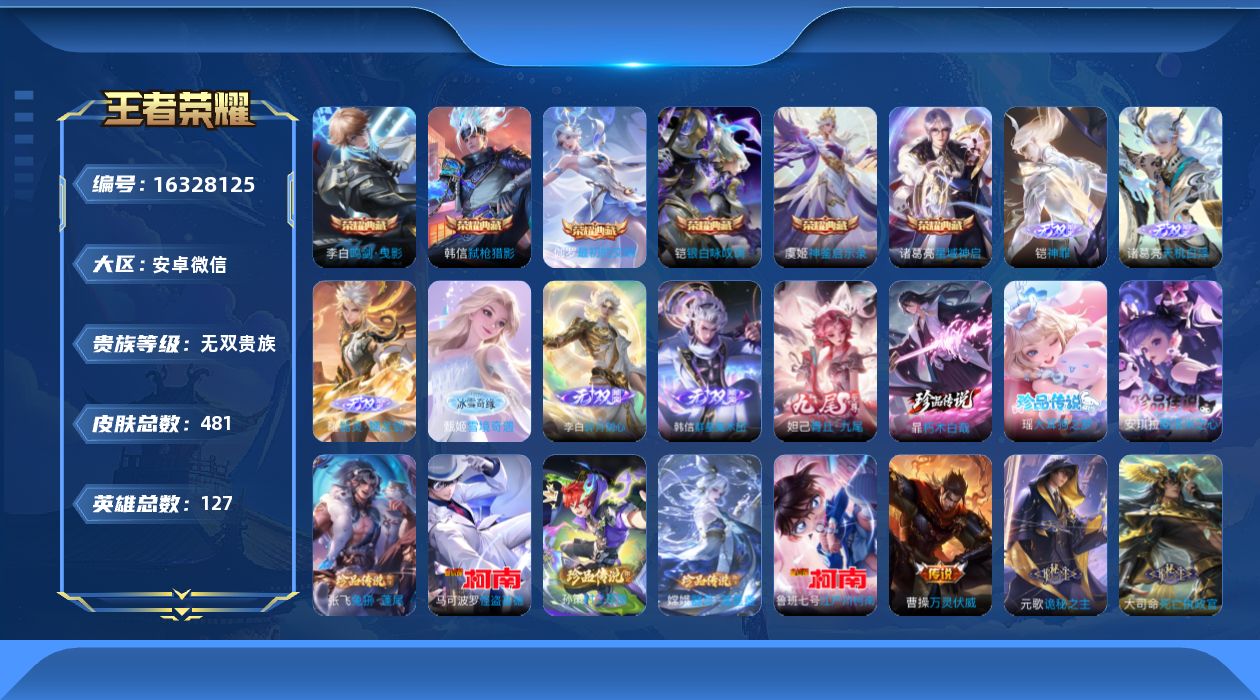 [16328125]安卓WX-V11-社交限制介意勿拍-最强王者段位-127英雄-481皮肤-6典藏皮肤-7星元-7无双-8珍品传说-56传说-113按键-151史诗
