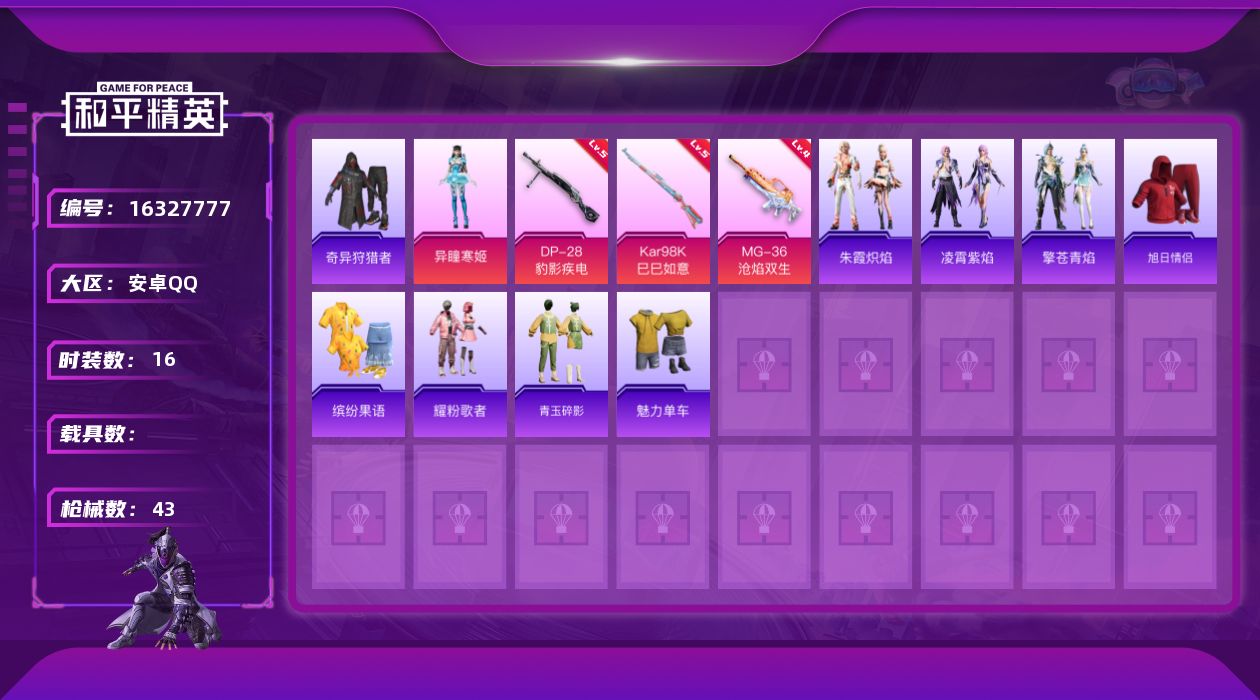[16327777]安卓 手Q-1粉装-3特效枪-0载具-0粉色飞行器-10834热力值-1王牌印记-16套装-43枪皮 【热门品类】:套装-奇异狩猎者 【粉色套装】:角色-异瞳寒姬 【粉色枪皮等级】:Kar98K-巳巳如意(五级),DP-28-豹影疾电(五级),MG-36-沧焰双生(四级) 【粉色枪皮】:Kar98K-巳巳如意,DP-28-豹影疾电,MG-36-沧焰双生 【稀有套装】:套装-朱霞炽焰,套装-凌霄紫焰,套装-擎苍青焰 【稀有枪皮】:SCAR-L-炫彩节奏,SCAR-L-红色方程式,M416-蓝色火焰,QBZ-洛神天依,AC-VAL-天降萌叽,ACE32-钛晶裂爪,ARX-凌霄紫焰,UZI-天降萌叽,汤姆逊-天降萌叽,JS9-凌霄紫焰,P90-巳巳如意,M24-樱桃泡泡,SKS-炫彩节奏,AMR-喜羊羊与灰太狼,S12K-玩趣呆呆,DP-28-彩虹符号,MG3-幻世战舞者,MG-36-凌霄紫焰,P92-凌霄紫焰,爆炸猎弓-喜羊羊与灰太狼,撬棍-冷漠罗丽,平底锅-凌霄紫焰 【其他套装】:套装-旭日情侣,套装-缤纷果语,套装-耀粉歌者,套装-青玉碎影,套装-魅力单车,套装-奇异狩猎者 【营地ID】:998038778