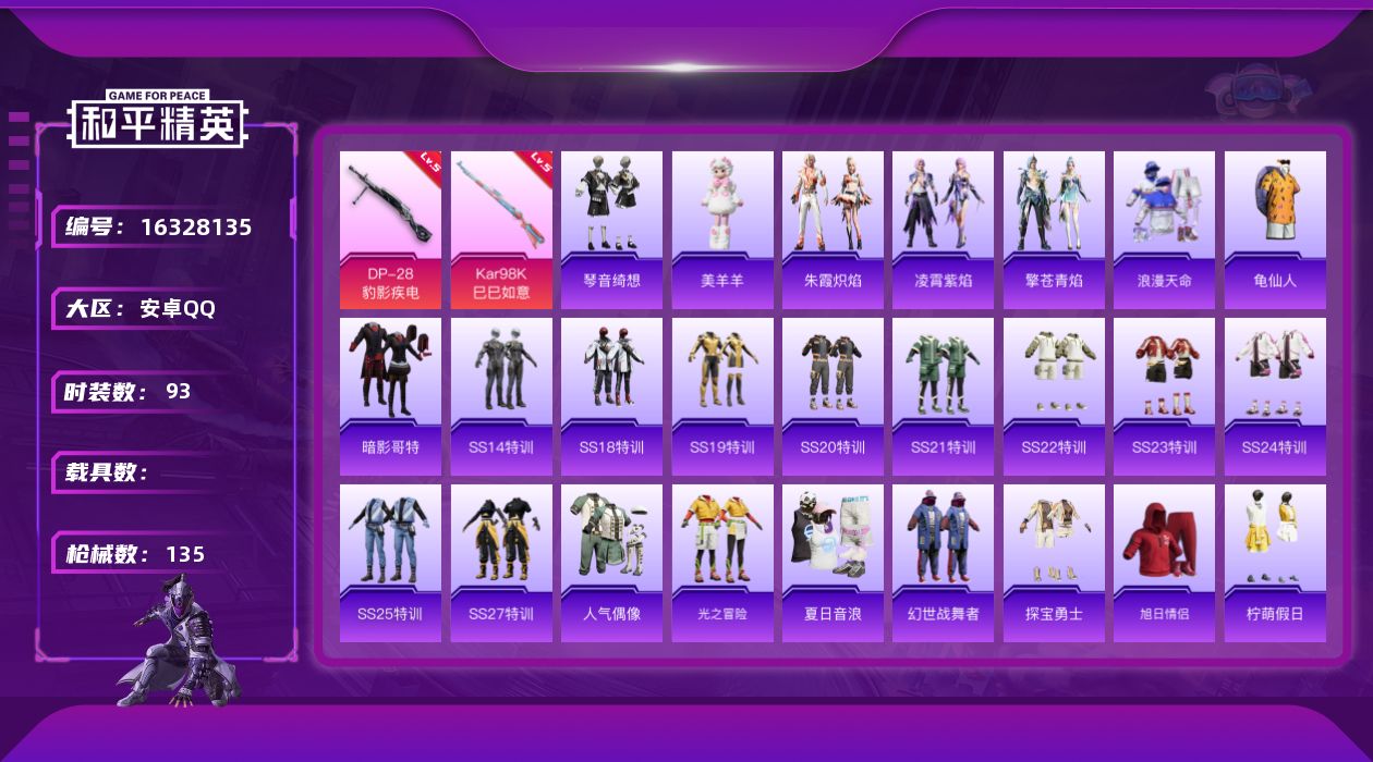 [16328135]【特价出售/店主推荐】 安卓 手Q-1粉装-2特效枪-0载具-1粉色飞行器-36379热力值-5王牌印记-93套装-135枪皮【热门品类】:套装-浪漫天命,套装-龟仙人,套装-暗影哥特【粉色套装】:角色-罪夜之冕【粉色枪皮等级】:Kar98K-巳巳如意(五级),DP-28-豹影疾电(五级)【粉色枪皮】:Kar98K-巳巳如意,DP-28-豹影疾电