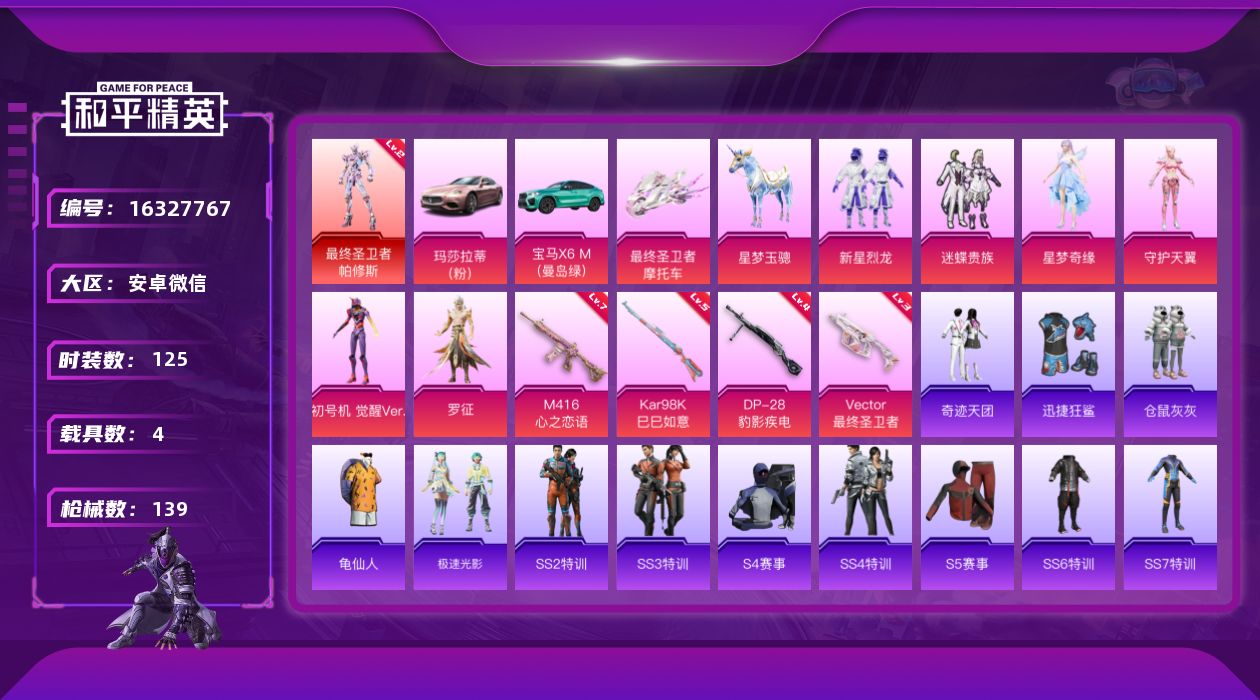 [16327767]【特价出售/店主推荐】安卓 微信-1神装-6粉装-4特效枪-4载具-3粉色飞行器-49567热力值-14王牌印记-125套装-139枪皮【红色神装等级】:最终圣卫者-帕修斯(二级)【红色角色神装】:最终圣卫者-帕修斯【热门品类】:套装-SS1特训,套装-龟仙人【粉色套装】:粉装-新星烈龙,粉装-迷蝶贵族,角色-星梦奇缘,角色-守护天翼,角色-初号机 觉醒Ver.,角色-罗征【粉色枪皮等级】:M416-心之恋语(七级),Vector-最终圣卫者(三级),Kar98K-巳巳如意(五级),DP-28-豹影疾电(四级)【粉色载具】:玛莎拉蒂Ghibli(粉),宝马X6 M(曼岛绿),最终圣卫者摩托车,星梦玉骢【粉色枪皮】:M416-心之恋语,Vector-最终圣卫者,Kar98K-巳巳如意,DP-28-豹影疾电【粉色飞行器】:星梦奇缘飞行器,终晖之翼飞行器