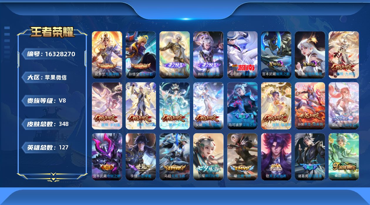 [16328270]苹果WX-V8-127英雄-347皮肤-2典藏皮肤-2无双-1珍品传说-24传说-100史诗-2星元