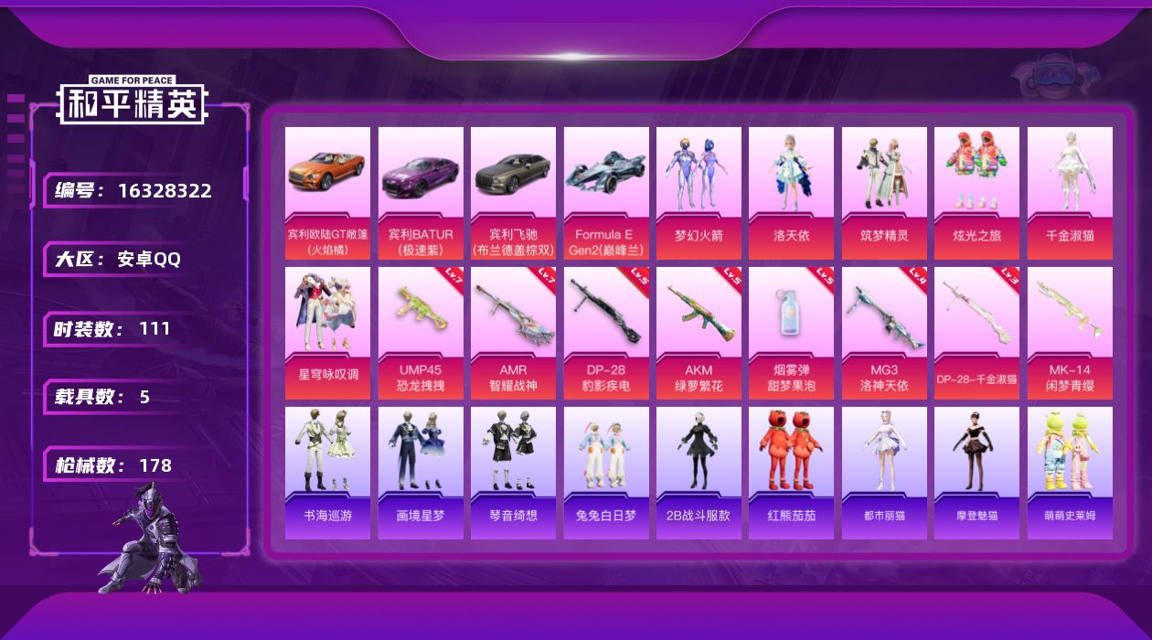 [16328322]背包1200扭蛋碎片【特价出售/店主推荐】安卓 手Q-1神装-6粉装-10特效枪-5载具-4粉色飞行器-62434热力值-12王牌印记-111套装-178枪皮【红色神装等级】:暮色玫影-艾丽娅(一级)【红色角色神装】:暮色玫影-艾丽娅【热门品类】:粉装-梦幻火箭,角色-2B战斗服款,套装-红熊茄茄【粉色套装】:粉装-梦幻火箭,角色-洛天依,粉装-筑梦精灵,粉装-炫光之旅,角色-千金淑猫,粉装-星穹咏叹调【粉色枪皮等级】:AKM-绿萝繁花(五级),AKM-暮色玫影(三级),UMP45-恐龙拽拽(七级),AKS-74U-森灵之息(五级),AMR-智耀战神(七级),DP-28-千金淑猫(三级),DP-28-豹影疾电(五级),MG3-洛神天依(四级),烟雾弹-甜梦果泡(五级)【粉色载具】:宾利欧陆GT敞篷(火焰橘),宾利BATUR(极速紫),宾利飞驰(布罗德盖棕双色),Formula E Gen2(巅峰兰),暮色幽蹄【粉色枪皮】:AKM-绿萝繁花,AKM-暮色玫影,UMP45-恐龙拽拽,AKS-74U-森灵之息,Mk14-闲梦青缨,AMR-智耀战神,DP-28-千金淑猫,DP-28-豹影疾电,MG3-洛神天依,烟雾弹-甜梦果泡【粉色飞行器】:梦幻火箭飞行器,沙丘之主天马,雀灵庇佑飞行器,暮色之舞飞行器