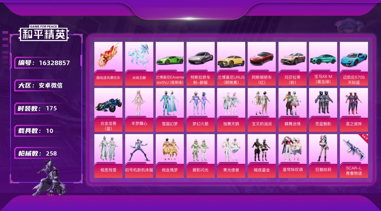 [16328857]【特价出售/店主推荐】安卓 微信-16粉装-13特效枪-10载具-11粉色飞行器-107717热力值-13王牌印记-175套装-258枪皮【热门品类】:粉装-雪国幻梦,粉装-梦幻火箭,套装-浪漫天命,角色-军刀雅典娜,套装-龟仙人,套装-暗影哥特,套装-浪漫波比,套装-粉红小猪,角色-六号稻草人【粉色套装】:粉装-独舞天鹅,粉装-宝贝奶油派,粉装-雪国幻梦,粉装-蝶舞迷情,粉装-梦幻火箭,粉装-苍蓝魅影,粉装-星之彼岸,粉装-相思残雪,角色-初号机款机体服,粉装-绚金瑰梦,粉装-碧影闪光,粉装-寒光使者,粉装-暗夜鎏金,粉装-星穹咏叹调,角色-狂魅哈莉,角色-羊梦糖心【粉色枪皮等级】:AKM-炫紫旋律(六级),SCAR-L-青春物语(七级),M416-五爪金龙(一级),M416-心之恋语(七级),UMP45-相思残雪(七级),汤姆逊-热量炸弹(五级),AKS-74U-星穹咏叹调(五级),M24-暗星紫秘(四级),AWM-花间之火(五级),DP-28-豹影疾电(五级),MG-36-沧焰双生(五级),烟雾弹-甜梦果泡(五级),破片手榴弹-瓶中星球(七级)【粉色载具】:特斯拉Roadster(沁心粉),兰博基尼Aventador SVJ(翡翠绿),兰博基尼URUS(明艳黄),阿斯顿马丁DBS(红),玛莎拉蒂Ghibli(粉),宝马X6 M(曼岛绿),迈凯伦570S(天际蓝),合金龙骨(蓝),踏焰逐风摩托车,空客H135-蔚蓝之翼,冰绡玉鳞【粉色枪皮】:AKM-炫紫旋律,SCAR-L-青春物语,M416-五爪金龙,M416-心之恋语,UMP45-相思残雪,汤姆逊-热量炸弹,AKS-74U-星穹咏叹调,M24-暗星紫秘,AWM-花间之火,DP-28-豹影疾电,MG-36-沧焰双生,烟雾弹-甜梦果泡,破片手榴弹-瓶中星球【粉色飞行器】:绝对恒星飞行器,梦幻火箭飞行器,古堡领主飞行器,激战未来飞行器,齐天大圣飞行器,风花雪月飞行器,绚金瑰梦飞行器,天之羽翼飞行器,飞天猪飞行器,灵珠游龙飞行器