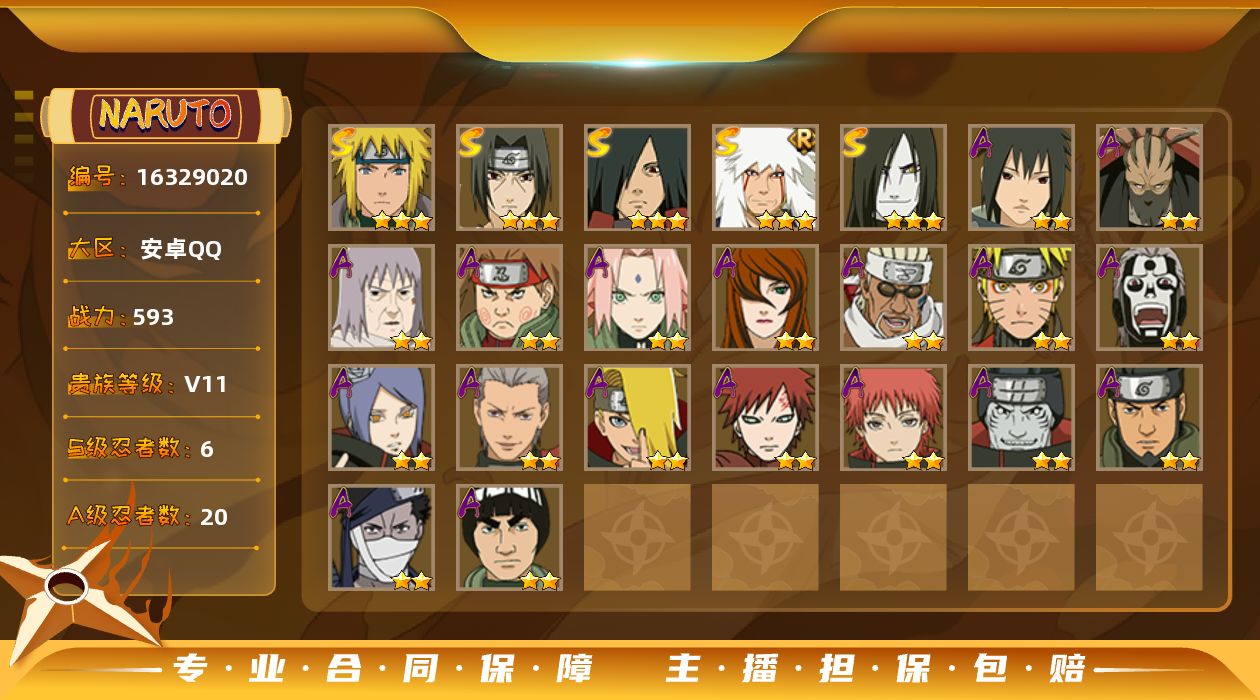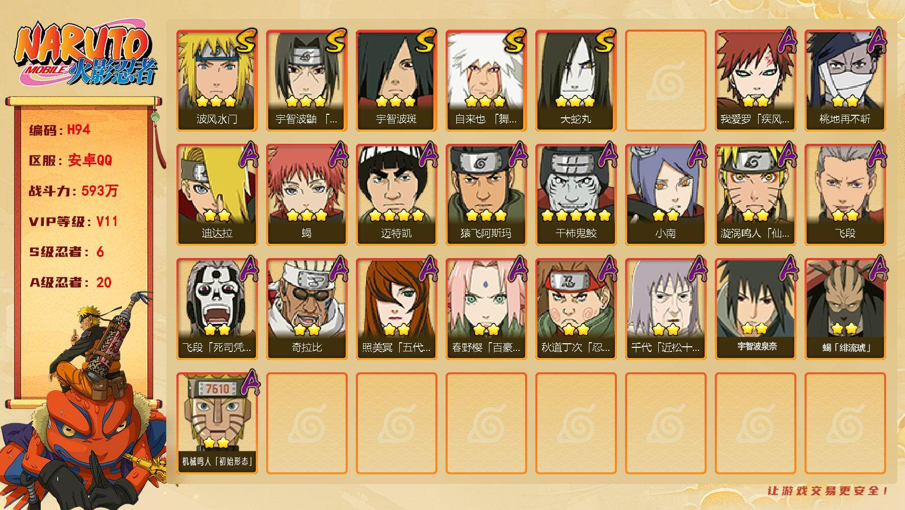 【S级忍者】:宇智波鼬「须佐能乎」(3星),自来也「舞之豪杰」(3星),大蛇丸(3星),宇智波斑(3星),波风水门(3星),漩涡鸣人·宇智波佐助(3星)