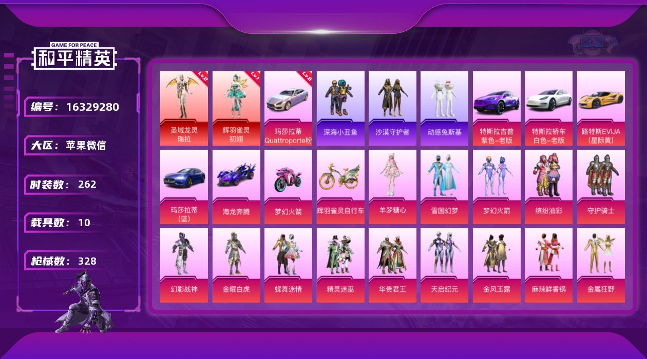 [16329280]【特价出售/店主推荐】 苹果 微信-2神装-38粉装-29特效枪-10载具-14粉色飞行器-169542热力值-14王牌印记-262套装-328枪皮【红色载具】:玛莎拉蒂Quattroporte(幻星粉)(六级)【红色神装等级】:辉羽雀灵-初翊(一级),圣域龙灵-瑞拉(二级)【红色角色神装】:辉羽雀灵-初翊,圣域龙灵-瑞拉【热门品类】:粉装-雪国幻梦,粉装-梦幻火箭,粉装-缤纷油彩,套装-浪漫天命,套装-深海小丑鱼,套装-沙漠守护者,套装-暗夜行者,套装-动感兔斯基人偶服,套装-潮萌小黄鸭,套装-浪漫波比,套装-粉红小猪,套装-萌熊伴侣,角色-六号稻草人【粉色套装】:粉装-守护骑士,粉装-幻影战神,粉装-金曜白虎,粉装-雪国幻梦,粉装-蝶舞迷情,粉装-精灵迷巫,粉装-梦幻火箭,粉装-华贵君王,粉装-天启纪元,粉装-金风玉露,粉装-麻辣鲜香锅,粉装-金属狂野,粉装-静灵氛围,粉装-智能音符,粉装-缤纷油彩,粉装-PEL轰鸣竞梦者,粉装-古堡领主,粉装-天禅智恒,粉装-狩月元帅,粉装-新星烈龙,粉装-向日葵,粉装-甜蜜誓约,粉装-香水柠檬,角色-洛天依,粉装-海渊国主,角色-初号机款机体服,粉装-恐龙拽拽,粉装-赤焰黑爵,粉装-炙焰牛王,粉装-暖熊萌萌,粉装-鸾凤武仙,粉装-太空嘟嘟,粉装-冰川幽秘,粉装-冰川红玫,角色-冰炎战车,角色-紫钛骑兵,粉装-幻彩电音,角色-羊梦糖心【粉色枪皮等级】:AKM-炫紫旋律(一级),AKM-熔岩统帅(三级),SCAR-L-梦幻火箭(五级),M416-五爪金龙(一级),M416-风花雪月(一级),M416-暖熊萌萌(一级),M416-至情至圣(九级),GROZA-香水柠檬(七级),AUG-妙趣可丽(七级),AUG-暖羊咩咩(一级),M762-甜蜜誓约(六级),M762-冷魅冰骑(二级),UZI-畅跳缤纷(五级),UMP45-雪国精灵(一级),UMP45-玉魂晶魄(八级),汤姆逊-冰川粉黛(四级),AKS-74U-星穹咏叹调(五级),P90-甜蜜草莓(五级),Kar98K-圣域龙灵(二级),M24-翩跹演武(四级),AWM-橘柚倾心(五级),Mini14-龙虾霸霸(四级),Mk14-甜梦熊击(五级),S12K-海渊国主(四级),DP-28-豹影疾电(五级),MG3-炙焰牛王(一级),MG3-辉羽雀灵(三级),MG-36-沧焰双生(五级