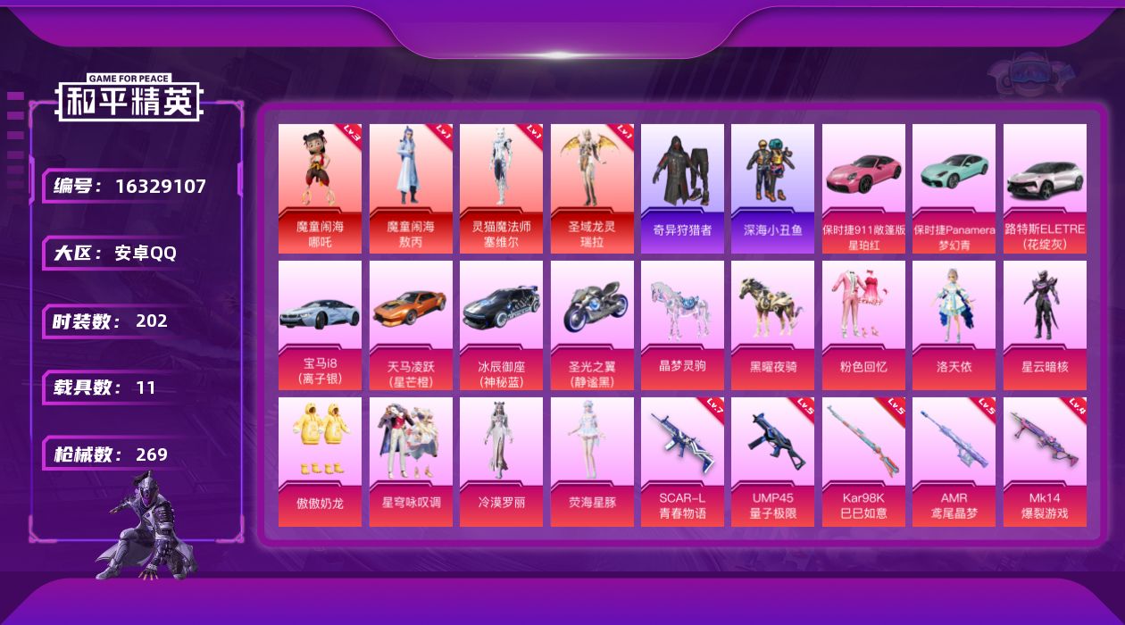 [16329107]【特价出售/店主推荐】安卓 手Q-4神装-7粉装-18特效枪-11载具-11粉色飞行器-104704热力值-14王牌印记-202套装-269枪皮【红色神装等级】:魔童闹海-敖丙(一级),魔童闹海-哪吒(三级),灵猫魔法师-塞维尔(一级),圣域龙灵-瑞拉(一级)【红色角色神装】:魔童闹海-敖丙,魔童闹海-哪吒,灵猫魔法师-塞维尔,圣域龙灵-瑞拉【热门品类】:套装-浪漫天命,套装-深海小丑鱼,套装-小丑鱼,套装-奇异狩猎者,角色-军刀雅典娜,套装-龟仙人,套装-暗影哥特,角色-8号机,角色-Mark.06,角色-六号稻草人【粉色套装】:粉装-粉色回忆,角色-洛天依,角色-星云暗核,粉装-傲傲奶龙,粉装-星穹咏叹调,角色-冷漠罗丽,角色-荧海星豚【粉色枪皮等级】:SCAR-L-青春物语(七级),M416-电玩时刻(一级),M416-灵猫魔法师(三级),蜜獾-荧海星豚(一级),Famas-翎光蝶翼(一级),UMP45-量子极限(五级),Vector-最终圣卫者(三级),P90-冷漠罗丽(一级),P90-魔童闹海 敖丙(三级),Kar98K-巳巳如意(五级),Kar98K-圣域龙灵(一级),M24-镜域双华(三级),Mk14-爆裂游戏(四级),AMR-鸢尾晶梦(五级),AMR-智耀战神(一级),DP-28-豹影疾电(二级),MG3-辉羽雀灵(三级),镰刀-幽影之判(一级)【粉色载具】:路特斯ELETRE(花绽灰),宝马i8(离子银),天马凌跃(星芒橙),冰辰御座(神秘蓝),保时捷911 敞篷版(星珀红),保时捷Panamera(梦幻青),圣光之翼(静谧黑),僚机-圣域龙宝,晶梦灵驹,黑曜夜骑【粉色枪皮】:SCAR-L-青春物语,M416-电玩时刻,M416-灵猫魔法师,蜜獾-荧海星豚,Famas-翎光蝶翼,UMP45-量子极限,Vector-最终圣卫者,P90-冷漠罗丽,P90-魔童闹海 敖丙,Kar98K-巳巳如意,Kar98K-圣域龙灵,M24-镜域双华,Mk14-爆裂游戏,AMR-鸢尾晶梦,AMR-智耀战神,DP-28-豹影疾电,MG3-辉羽雀灵,镰刀-幽影之判【粉色飞行器】:镜域双华-灵镜之阶,龙翔九天飞行器,圣域金龙飞行器,雀灵庇佑飞行器,终晖之翼飞行器,灵猫魔法师飞行器,飞天猪飞行器,灵珠游龙飞行器