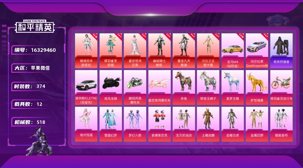 [16329460]有二次可直接换绑【特价出售/店主推荐】苹果 微信-6神装-30粉装-29特效枪-12载具-17粉色飞行器-227748热力值-35王牌印记-374套装-518枪皮【红色载具】:玛莎拉蒂Quattroporte(幻星粉)(一级),宝马M4(灿阳金)(六级)【红色神装等级】:辉羽雀灵-初翊(一级),盛世惊鸿-云鸾(一级),幽焰骑士-维塔(一级),墨龙九天-敖渊(一级),镜域双华-欧若拉(六级),沙丘之主-图卡盟(一级)【红色角色神装】:辉羽雀灵-初翊,盛世惊鸿-云鸾,幽焰骑士-维塔,墨龙九天-敖渊,镜域双华-欧若拉,沙丘之主-图卡盟【热门品类】:粉装-雪国幻梦,粉装-梦幻火箭,粉装-音爆索尼克,绝对防御上衣,套装-浪漫天命,套装-小丑鱼,套装-奇异狩猎者,套装-忍者信条,套装-SS1特训,角色-忠猛周仓,角色-忠真马岱,角色-忠义严颜,套装-龟仙人,套装-浪漫波比,套装-粉红小猪,角色-8号机,角色-Mark.06,M416-星际漫游,大砍刀-青龙偃月刀,撬棍-龙胆亮银枪【粉色套装】:角色-绝对恒星,粉装-宝贝奶油派,粉装-土曜战麒,粉装-金曜白虎,粉装-雪国幻梦,粉装-梦幻火箭,粉装-金属狂野,粉装-智能音符,粉装-新星烈龙,粉装-向日葵,粉装-俏皮狐尾,粉装-香水柠檬,粉装-星之彼岸,角色-洛天依,粉装-碧影闪光,粉装-旋转彩虹,粉装-音爆索尼克,粉装-第五大道,粉装-天星战神,角色-擎天柱,粉装-闲梦青缨,粉装-镜光幻境,角色-圣堂之誓,角色-电波星,套装-创世·救赎,角色-初号机 觉醒Ver.,角色-千金淑猫,粉装-星穹咏叹调,角色-狂魅哈莉,角色-霁蓝缠春【粉色枪皮等级】:AKM-梦之光华(一级),AKM-魔法神域(一级),AKM-幽焰骑士(六级),SCAR-L-甜梦小狐(七级),SCAR-L-金蛇镇世(三级),M416-五爪金龙(四级),M416-超新星(九级),M416-墨龙九天(一级),M416-女娲灵识(一级),GROZA-香水柠檬(一级),GROZA-精灵之光(三级),AUG-暖羊咩咩(五级),M762-甜蜜誓约(七级),UMP45-量子极限(五级),野牛-流星咚咚(四级),P90-沙丘之主(一级),Kar98K-巳巳如意(五级),M24-莲影清波(一级),M24-镜域双华(一级),SLR-暗夜玫瑰(七级),AMR-智耀战神(五级),M417-第五