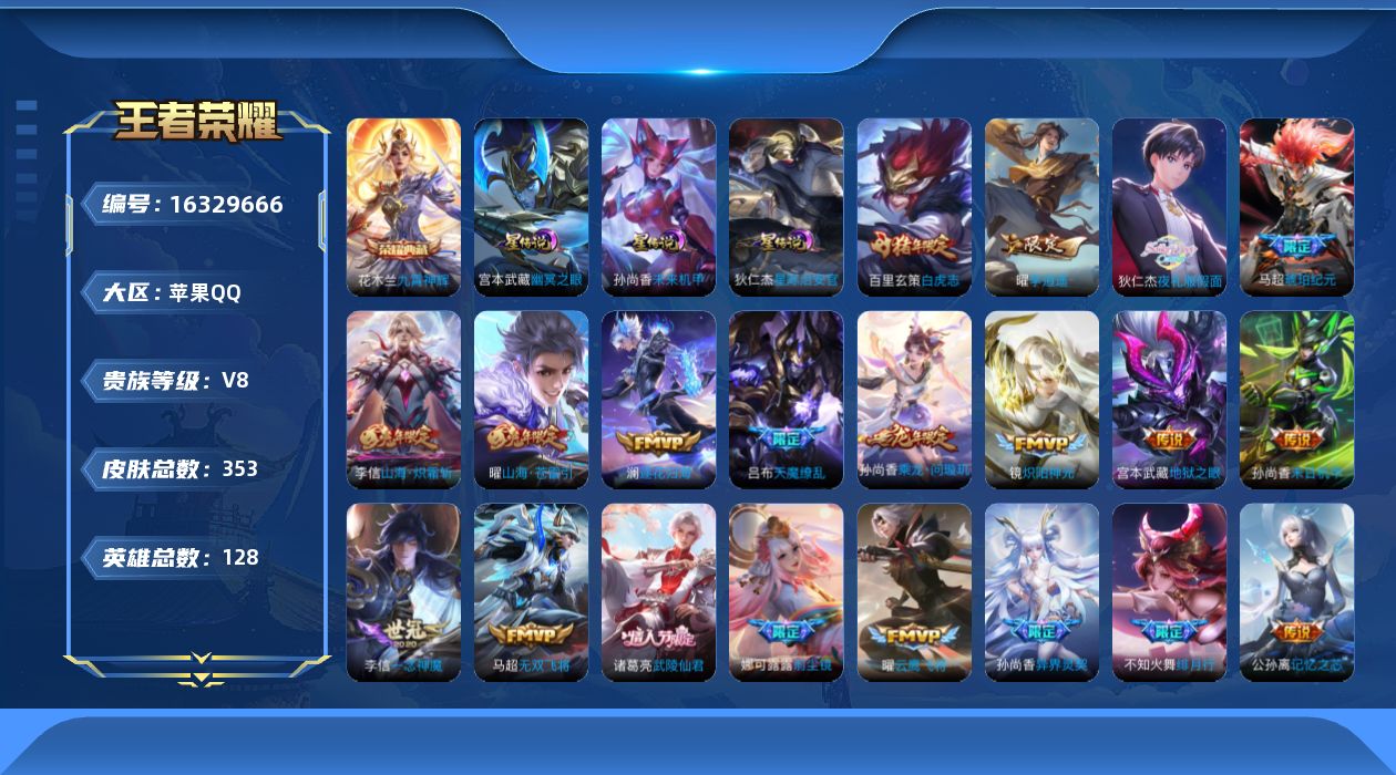 [16329666]苹果Q-V8-至尊星耀III段位-128英雄-353皮肤-1典藏皮肤-30传说-3星元-98史诗