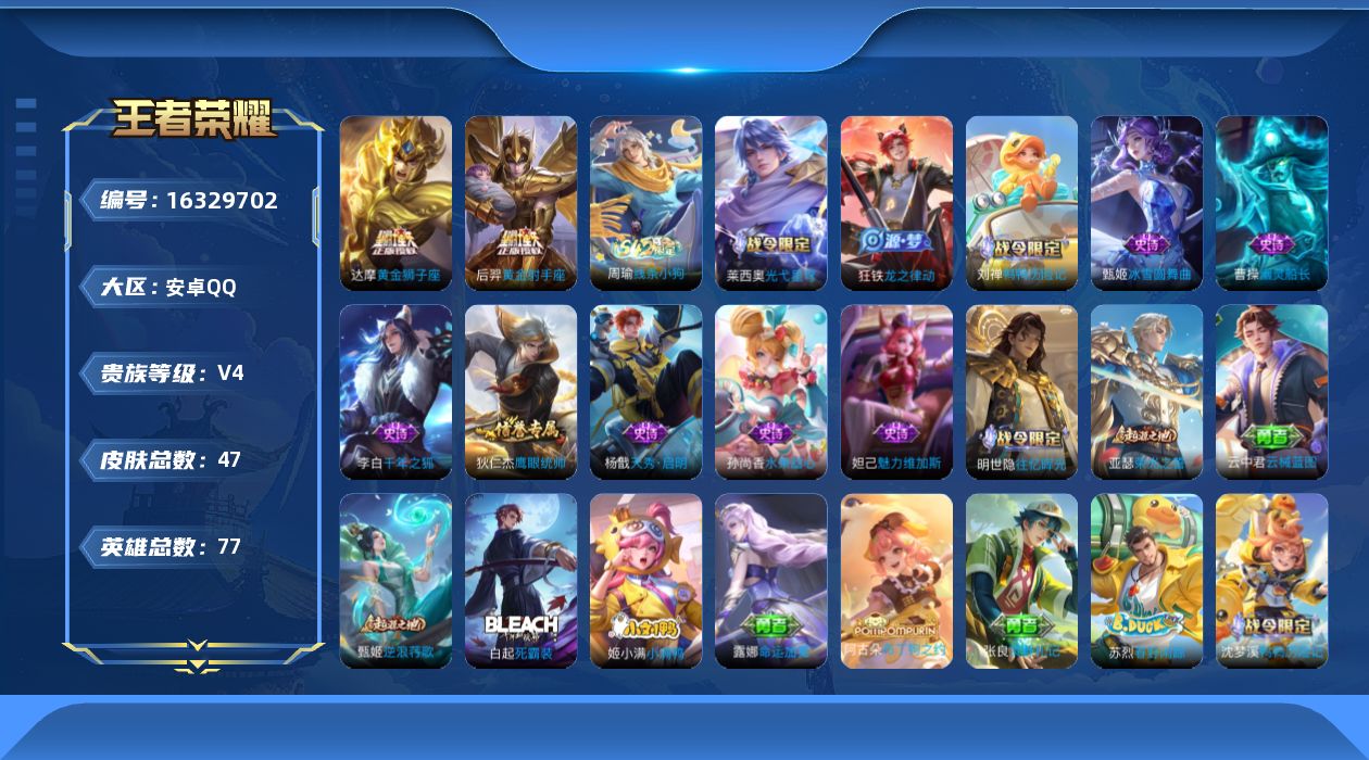 [16329702]安卓Q-V4-最强王者段位-77英雄-47皮肤-2传说-10史诗