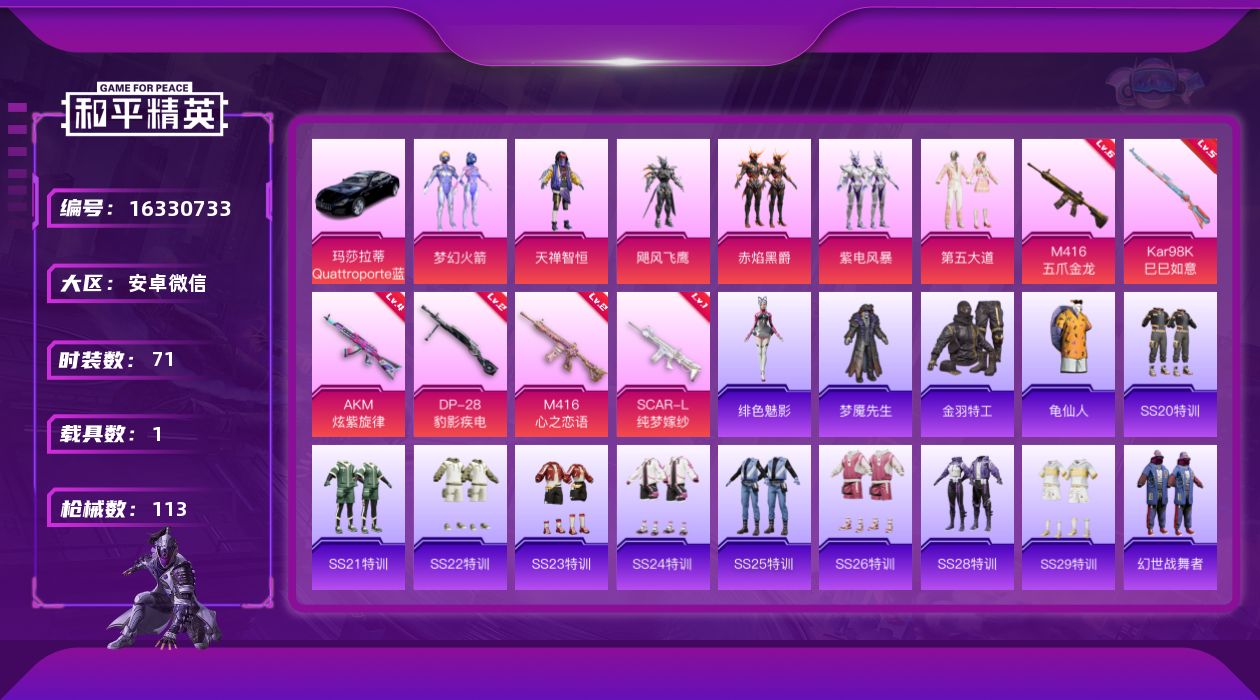 [16330733]【特价出售/店主推荐】安卓 微信-6粉装-6特效枪-1载具-1粉色飞行器-3.6w热力值-3王牌印记-71套装-113枪皮 【热门品类】:粉装-梦幻火箭,套装-金羽特工,套装-龟仙人 【粉色套装】:粉装-梦幻火箭,粉装-天禅智恒,粉装-飓风飞鹰,粉装-赤焰黑爵,粉装-紫电风暴,粉装-第五大道 【粉色枪皮等级】:AKM-炫紫旋律(四级),SCAR-L-纯梦嫁纱(一级),M416-五爪金龙(六级),M416-心之恋语(二级),Kar98K-巳巳如意(五级),DP-28-豹影疾电(二级) 【粉色载具】:玛莎拉蒂Quattroporte(夜幕蓝) 【粉色枪皮】:AKM-炫紫旋律,SCAR-L-纯梦嫁纱,M416-五爪金龙,M416-心之恋语,Kar98K-巳巳如意,DP-28-豹影疾电 【粉色飞行器】:冷魅冰骑飞行器 【粉色降落伞】:梦幻火箭降落伞,古战神甲降落伞,冷魅冰骑降落伞,环太平洋降落伞,第五大道降落伞 【稀有套装】:套装-龟仙人,角色-绯色魅影 【稀有枪皮】:AKM-破晓战魂,AKM-龙的传人,M16A4-幻世战舞者,SCAR-L-炫彩节奏,SCAR-L-玉兔迎春,SCAR-L-红色方程式,M416-彩虹嘻嘻猴,M416-糯团青竹,M416-红色方程式,M416-蓝色火焰,M416-诡夜天鹅,GROZA-懵萌河马,AUG-耀粉歌者,M762-天降萌叽,M762-第五大道,Mk47-妙红点点,G36C-冷魅冰骑,G36C-懵萌河马,AC-VAL-天降萌叽,蜜獾-天降萌叽,蜜獾-娇憨猪猪,UZI-啾咪啾咪,UZI-天降萌叽,UZI-娇憨猪猪,UMP45-蓝色火焰,汤姆逊-古战神甲,汤姆逊-天降萌叽,汤姆逊-耀粉歌者,野牛-天星战神,Kar98K-梦幻火箭,Kar98K-红色方程式,AWM-音爆索尼克,SKS-炫彩节奏,VSS-彩虹符号,Mini14-梦幻火箭,Mini14-炫彩节奏,Mini14-金玉无双,SLR-娇憨猪猪,莫辛纳甘-懵萌河马,AMR-妙红点点,M417-惊鸿侠骨,M417-猪猪侠,M200-仲夏莫吉托,M200-惊鸿侠骨,S686-奇异狩猎者,S686-红色方程式,S1897-小鹦鹉BEBE,S1897-星之信仰,S12K-玩趣呆呆,S12K-破晓战魂,S12K-娇憨猪猪,DBS-圣光天使,DBS-彩虹符号,DBS-第五大道,M249-冷魅冰骑,M
