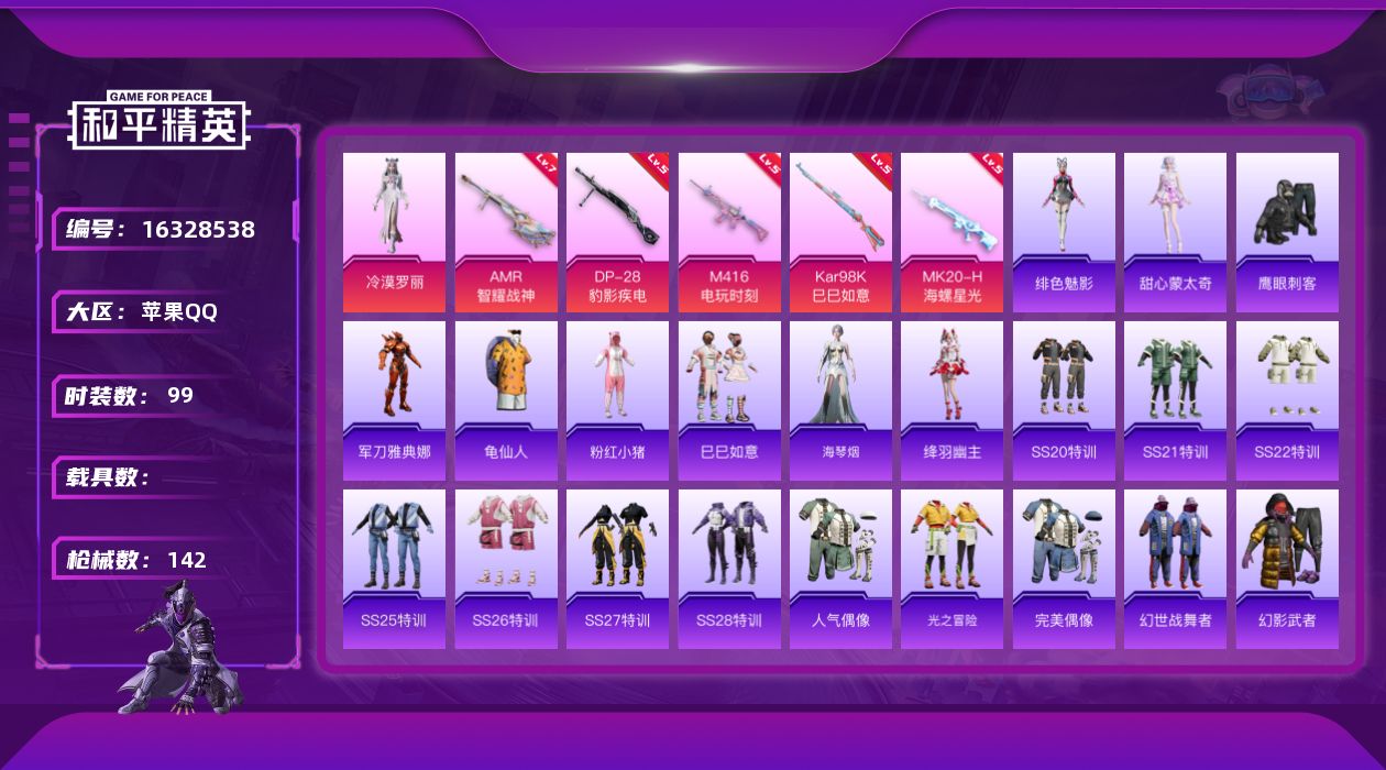 [16328538]【特价出售/店主推荐】苹果 手Q-1粉装-5特效枪--1粉色飞行器-3.7w热力值-11王牌印记-99套装-142枪皮