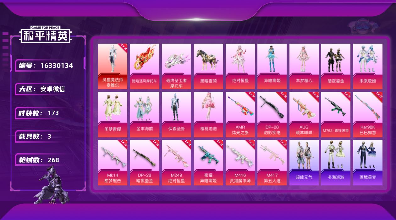 [16330134]安卓 微信-1神装-9粉装-11特效枪-3载具-5粉色飞行器-83760热力值-9王牌印记-173套装-268枪皮