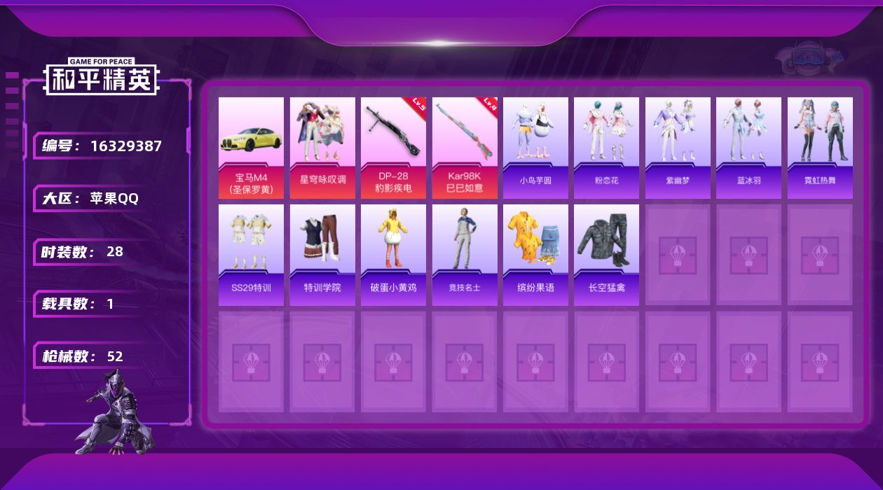 [16329387]【特价出售/店主推荐】苹果 手Q-1粉装-2特效枪-1载具-1.3w热力值-3王牌印记-28套装-52枪皮