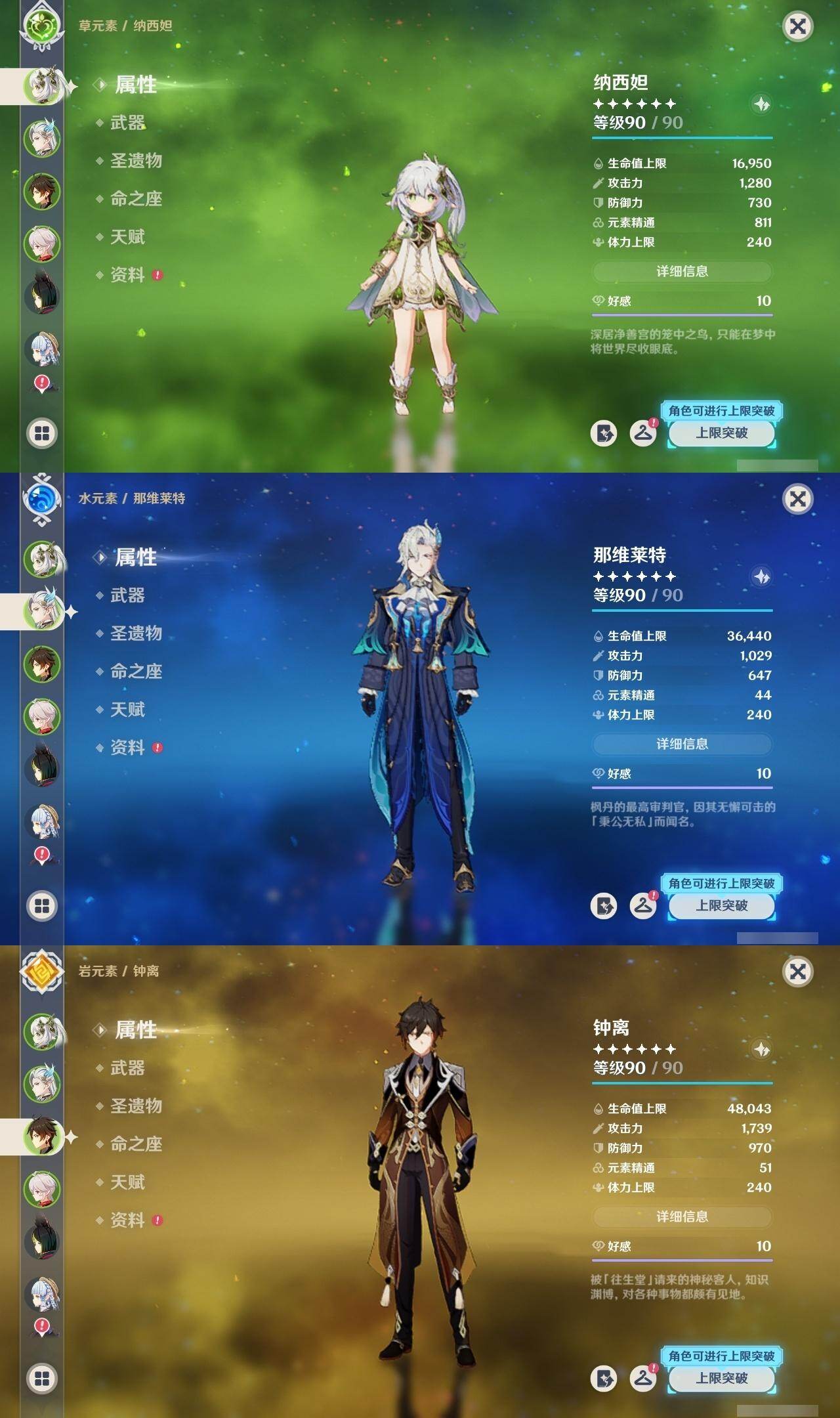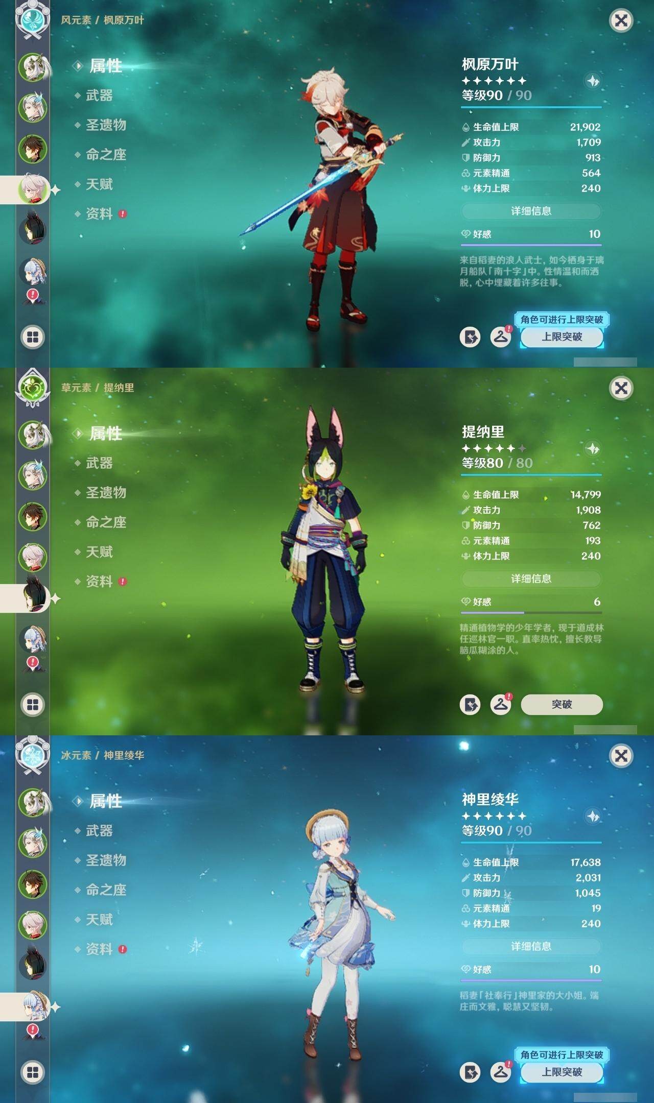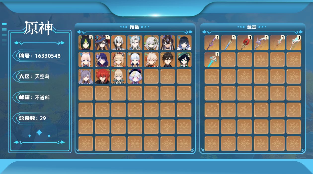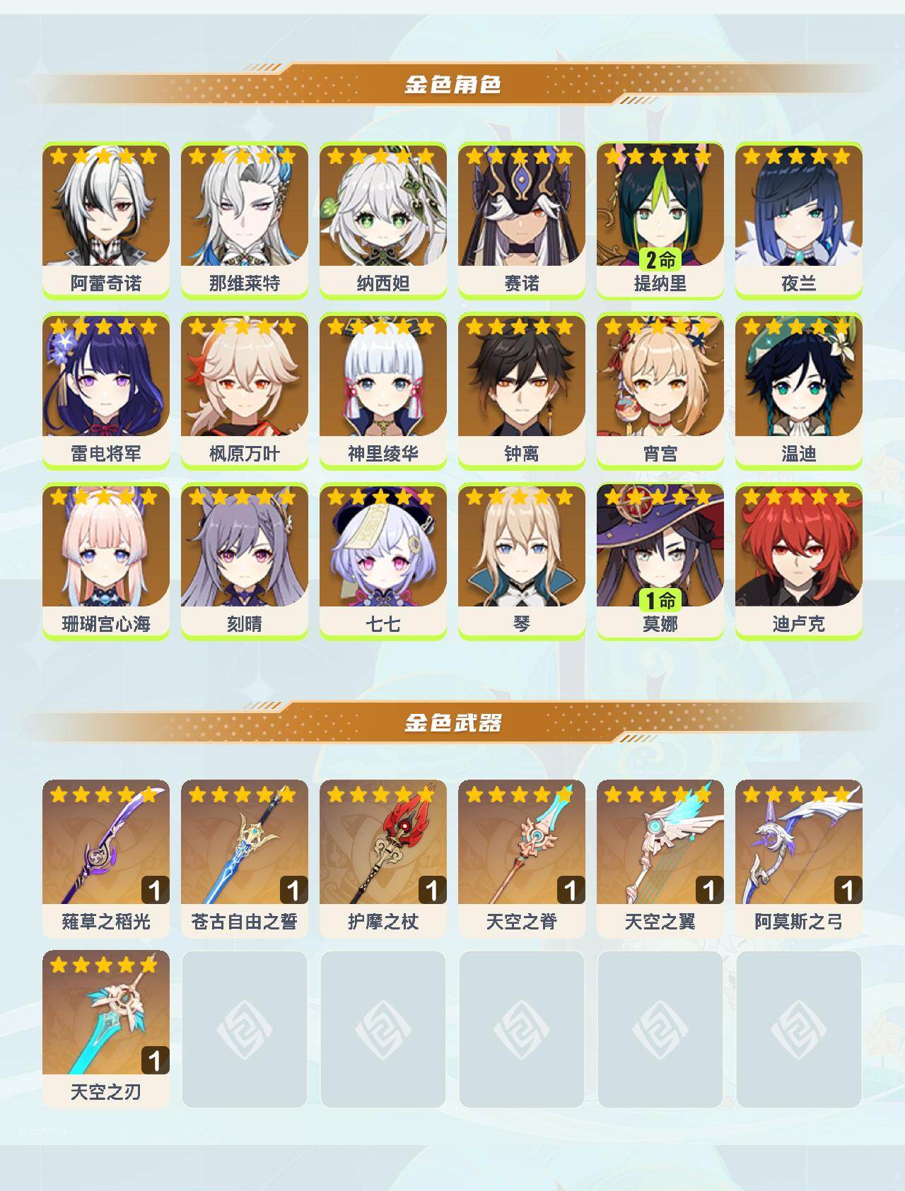 0命阿蕾奇诺,0命那维莱特,0命纳西妲,0命赛诺,2命提纳里,0命夜兰,0命雷电将军,0命枫原万叶,0命神里绫华,0命钟离,0命宵宫,0命温迪,0命珊瑚宫心海,0命刻晴,0命七七,0命琴,1命莫娜,0命迪卢克,精1薙草之稻光,精1苍古自由之誓,精1护摩之杖,精1天空之脊,精1天空之翼,精1阿莫斯之弓,精1天空之刃