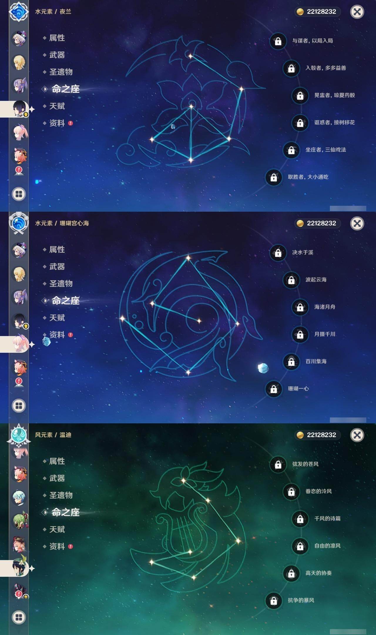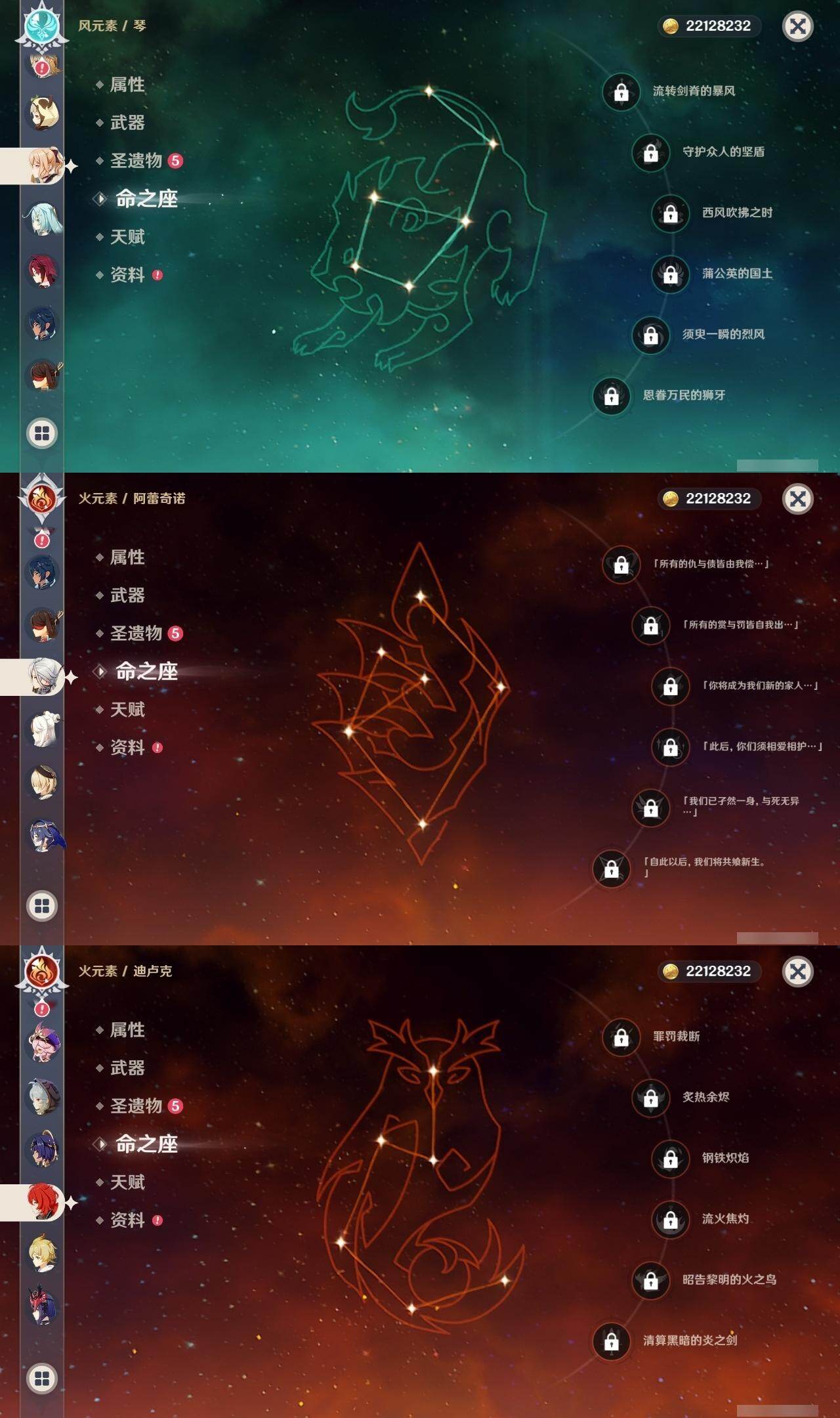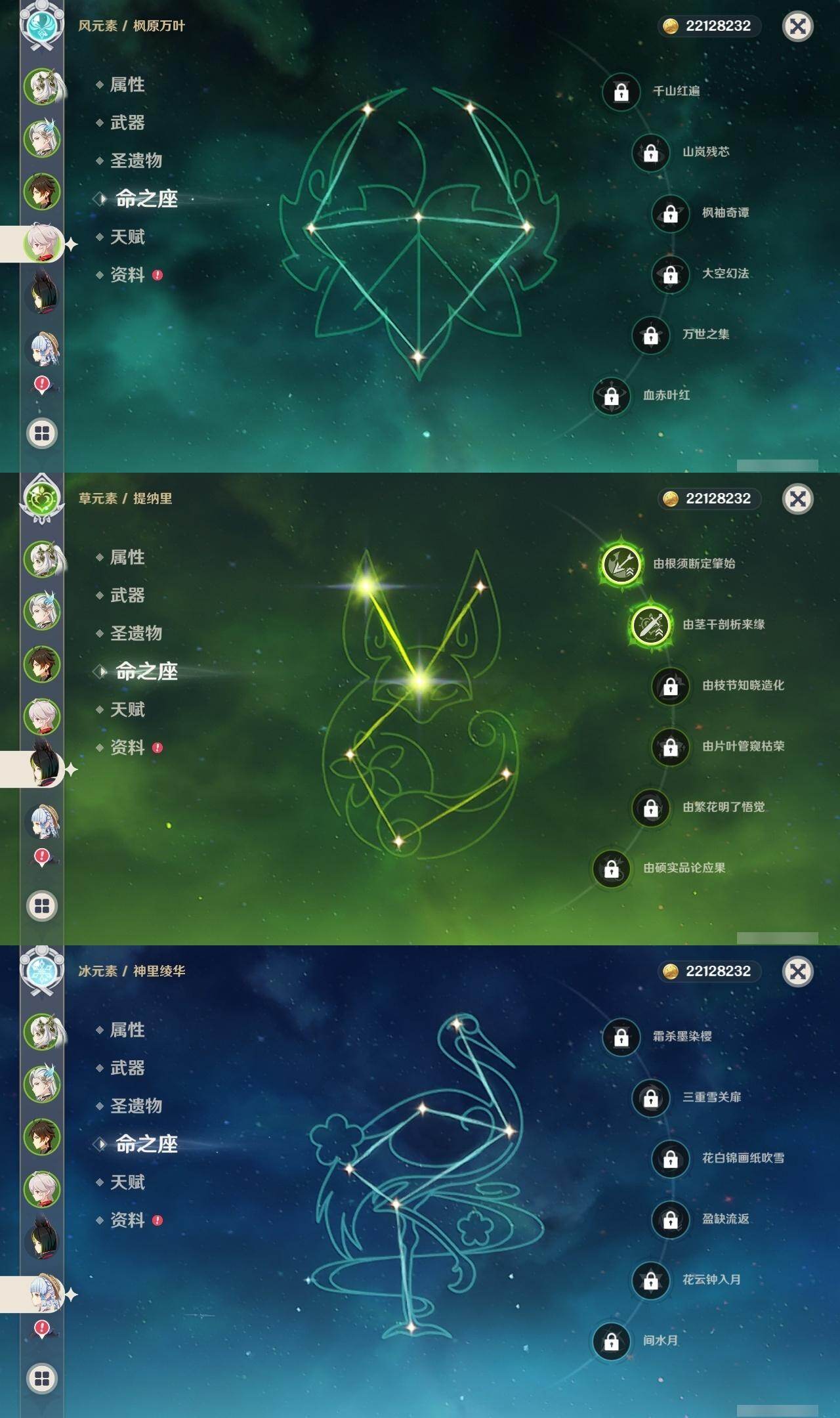 0命阿蕾奇诺,0命那维莱特,0命纳西妲,0命赛诺,2命提纳里,0命夜兰,0命雷电将军,0命枫原万叶,0命神里绫华,0命钟离,0命宵宫,0命温迪,0命珊瑚宫心海,0命刻晴,0命七七,0命琴,1命莫娜,0命迪卢克,精1薙草之稻光,精1苍古自由之誓,精1护摩之杖,精1天空之脊,精1天空之翼,精1阿莫斯之弓,精1天空之刃