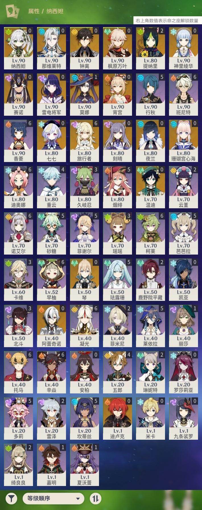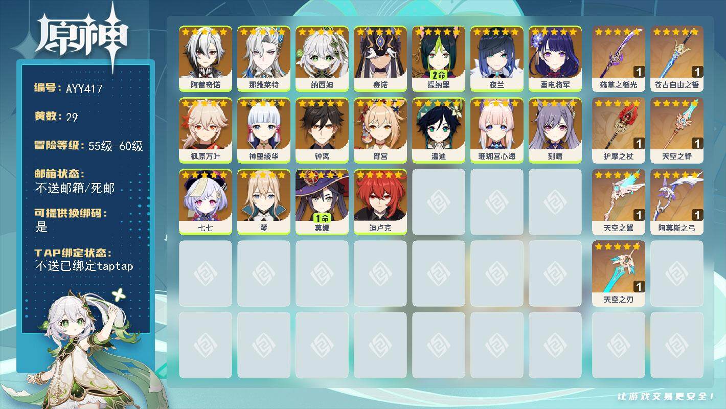 [16330548]59级/29黄/女主/18个五星角色/8个五星武器 0命阿蕾奇诺,0命那维莱特,0命纳西妲,0命赛诺,2命提纳里,0命夜兰,0命雷电将军,0命枫原万叶,0命神里绫华,0命钟离,0命宵宫,0命温迪,0命珊瑚宫心海,0命刻晴,0命七七,0命琴,1命莫娜,0命迪卢克,精1薙草之稻光,精1苍古自由之誓,精1护摩之杖,精1天空之脊,精1天空之翼,精1阿莫斯之弓,精1天空之刃