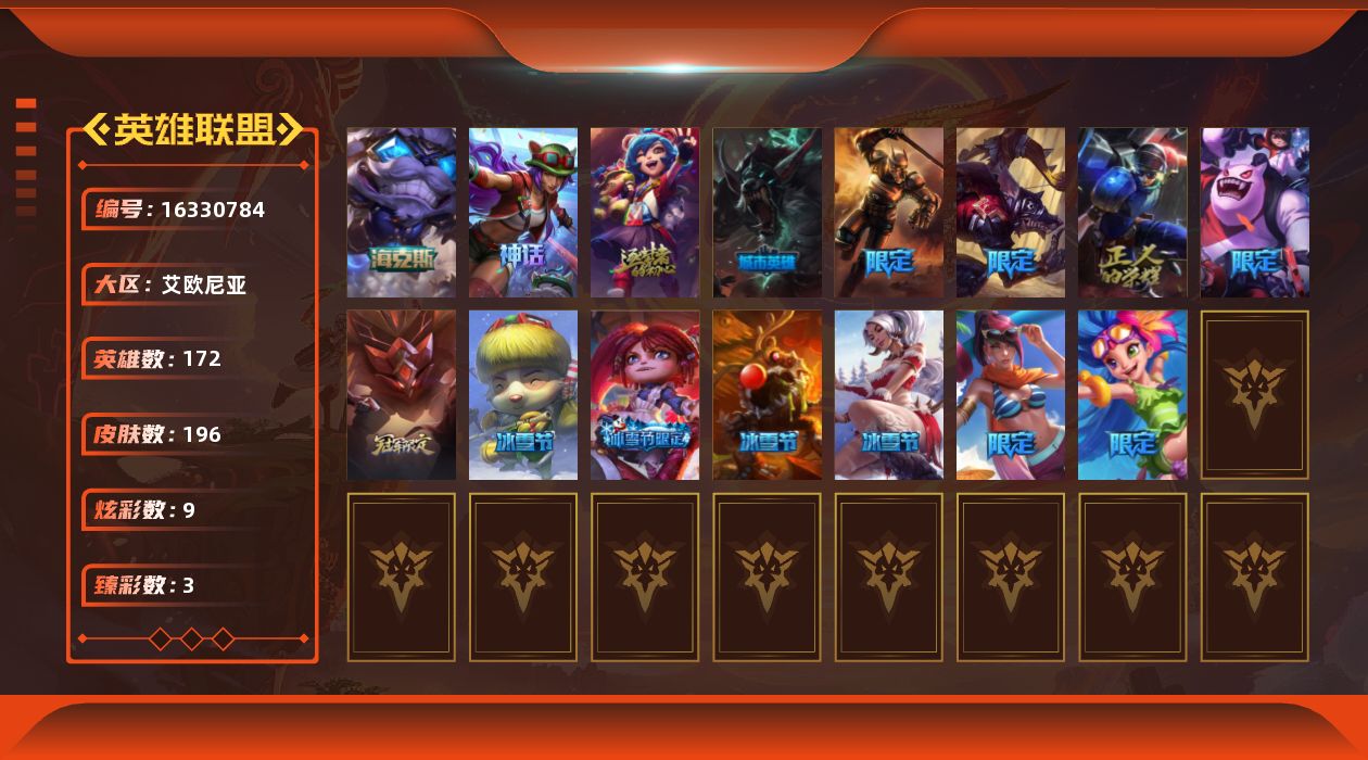[16330784]未定级段位-172英雄-196皮肤-9炫彩-0终极-4神话-16限定-10传说-54史诗