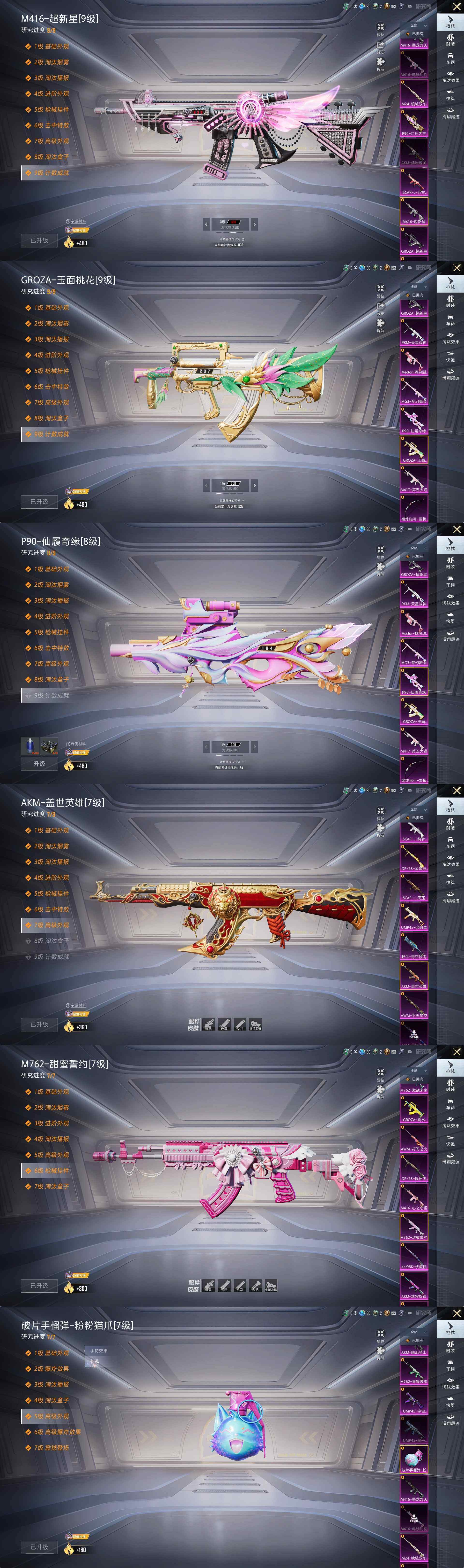 AKM-甜心宝贝,AKM-炫紫旋律,AKM-星际浪客,AKM-盖世英雄,AKM-熔岩统帅,AKM-幽焰骑士,M16A4-垂柳戏鸭,SCAR-L-梦幻火箭,SCAR-L-童趣迷兔,SCAR-L-青春物语,SCAR-L-甜梦小狐,SCAR-L-桃夭倾城,SCAR-L-天蓬元帅,SCAR-L-纯梦嫁纱,SCAR-L-金蛇镇世,M416-五爪金龙,M416-心之恋语,M416-暖熊萌萌,M416-至情至圣,M416-超新星,M416-电玩时刻,M416-墨龙九天,GROZA-香水柠檬,GROZA-旋转彩虹,GROZA-玉面桃花,GROZA-超新星,AUG-星之彼岸,AUG-妙趣可丽,AUG-许七安,M762-甜蜜誓约,M762-激战未来,M762-青锋波束,UZI-绮梦青鸾,UZI-筑梦精灵,UMP45-相思残雪,UMP45-恐龙拽拽,UMP45-玉魂晶魄,UMP45-启明星,UMP45-量子极限,UMP45-宇宙意志,Vector-红伞翩翩,Vector-环太平洋,Vector-灵感创作师,Vector-飒粉甜心,汤姆逊-荒漠赏金,汤姆逊-冰川粉黛,野牛-青空秋雨,AKS-74U-信仰神谕,P90-甜蜜草莓,P90-仙履奇缘,P90-沙丘之主,Kar98K-伏魔团,Kar98K-暗翼战神,Kar98K-圣光天使,Kar98K-巳巳如意,M24-星之信仰,M24-翩跹演武,M24-镜域双华,AWM-花间之火,AWM-橘柚倾心,AWM-平天焚空,SKS-碧影闪光,Mini14-绚金瑰梦,Mk14-盛世惊鸿,SLR-暗夜玫瑰,M417-第五大道,MK20-H-海螺星光,SVD-月影灵韵,S12K-海渊国主,M249-绒雪飘舞,M249-彩虹甜喵,DP-28-扶摇飞仙,DP-28-幻梦音符,DP-28-金蝉行者,MG3-洛神天依,MG3-炙焰牛王,MG3-梦幻舞会,PKM-天星战神,MG-36-幻梦之森,爆炸猎弓-雪梅暗香,平底锅-林间仙鹿,烟雾弹-丁香清露,破片手榴弹-粉粉猫爪
