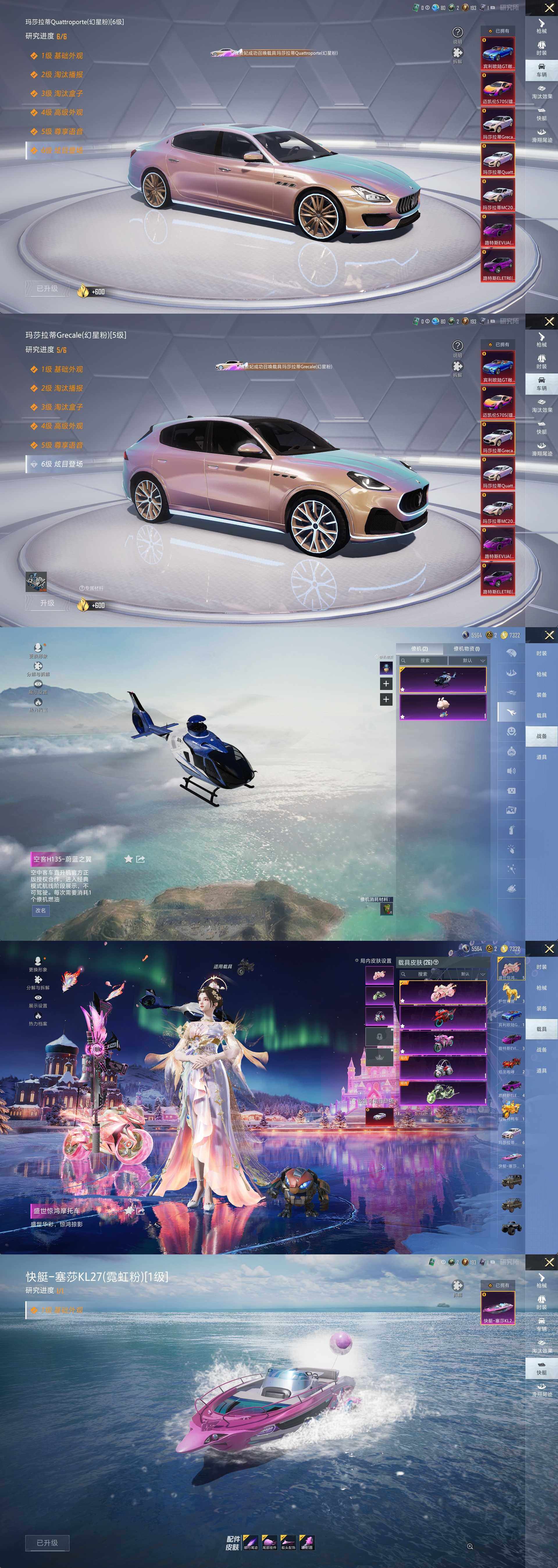 特斯拉Model_3(珍珠白),特斯拉Roadster(沁心粉),兰博基尼Estoque(银翼灰),阿斯顿·马丁DBX(橙),路特斯EVIJA(电光紫),路特斯ELETRE(电光紫),玛莎拉蒂MC20(幻星粉),玛莎拉蒂Quattroporte(幻星粉),玛莎拉蒂Ghibli(金),玛莎拉蒂Ghibli(粉),玛莎拉蒂Grecale(幻星粉),乔治·巴顿战车(辉煌金),宾利欧陆GT敞篷(深空蓝),迈凯伦570S(镭射紫),灵鼠银迹,焰龙咆哮,双人摩托-梦幻火箭,双人摩托-双刃魅影(红),布尔玛摩托车,幽焰风驰摩托车,盛世惊鸿摩托车,拉轰鸭鸭车,空客H135-蔚蓝之翼,僚机-萌兔起飞,快艇-塞莎KL27(霓虹粉),赤兔,照夜玉狮子,护世瑞兽