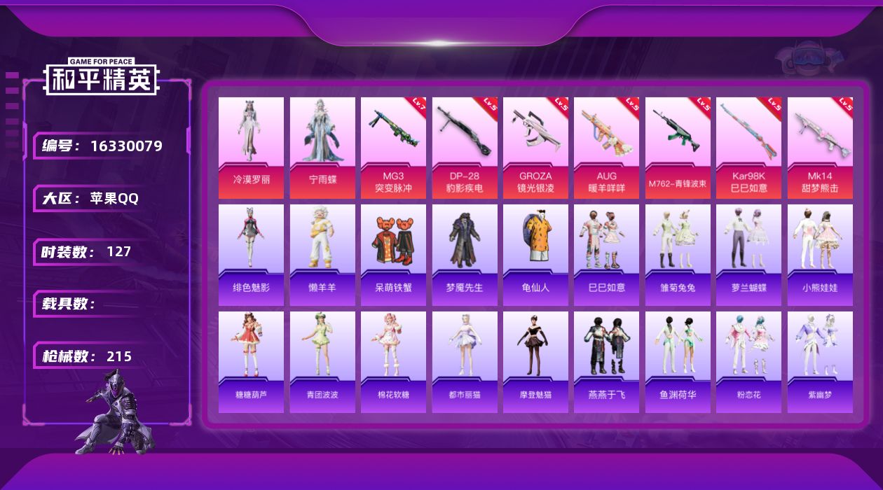 - PX_2097192- 苹果手Q-11王牌印记-14粉装-3特效枪-1载具-86340热力值-233套装-262枪皮-1卓越印记-1传奇印记 【14粉装】,梦幻火箭,甜心巧克力,宝贝奶油派,天使彩虹糖,缤纷油彩,放客神游,绯穹魔姬,花间之火,闲梦青缨,复仇流浪者,海盐物语,冰霜白皇,炙焰红王,星之彼岸 【3特效枪】SCAR-L-童趣迷兔-7级 M416-风花雪月-7级 Kar98K-巳巳如意-5级