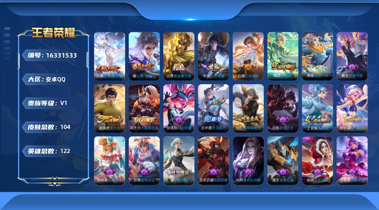 [16331533]安卓Q-V0-永恒钻石IV段位-122英雄-104皮肤-6传说-19史诗