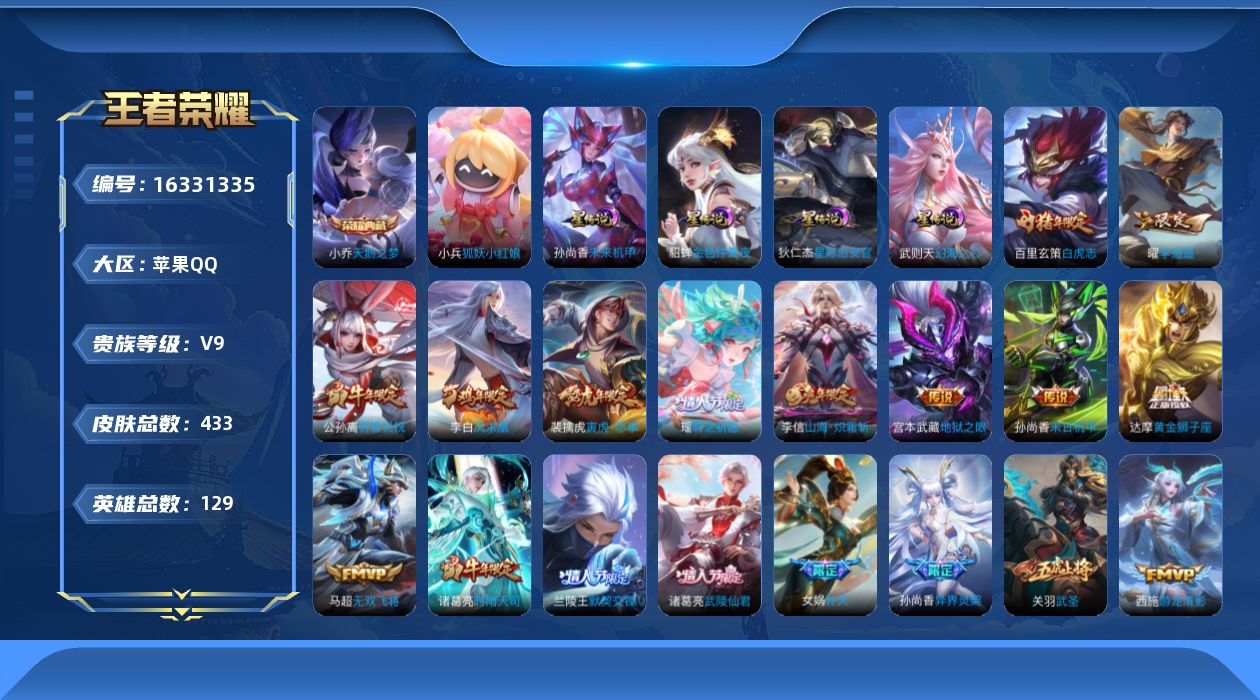 [16331335]苹果Q-V9-至尊星耀IV段位-129英雄-433皮肤-1典藏皮肤-1典藏英雄-33传说-157史诗-1小兵-6星传说