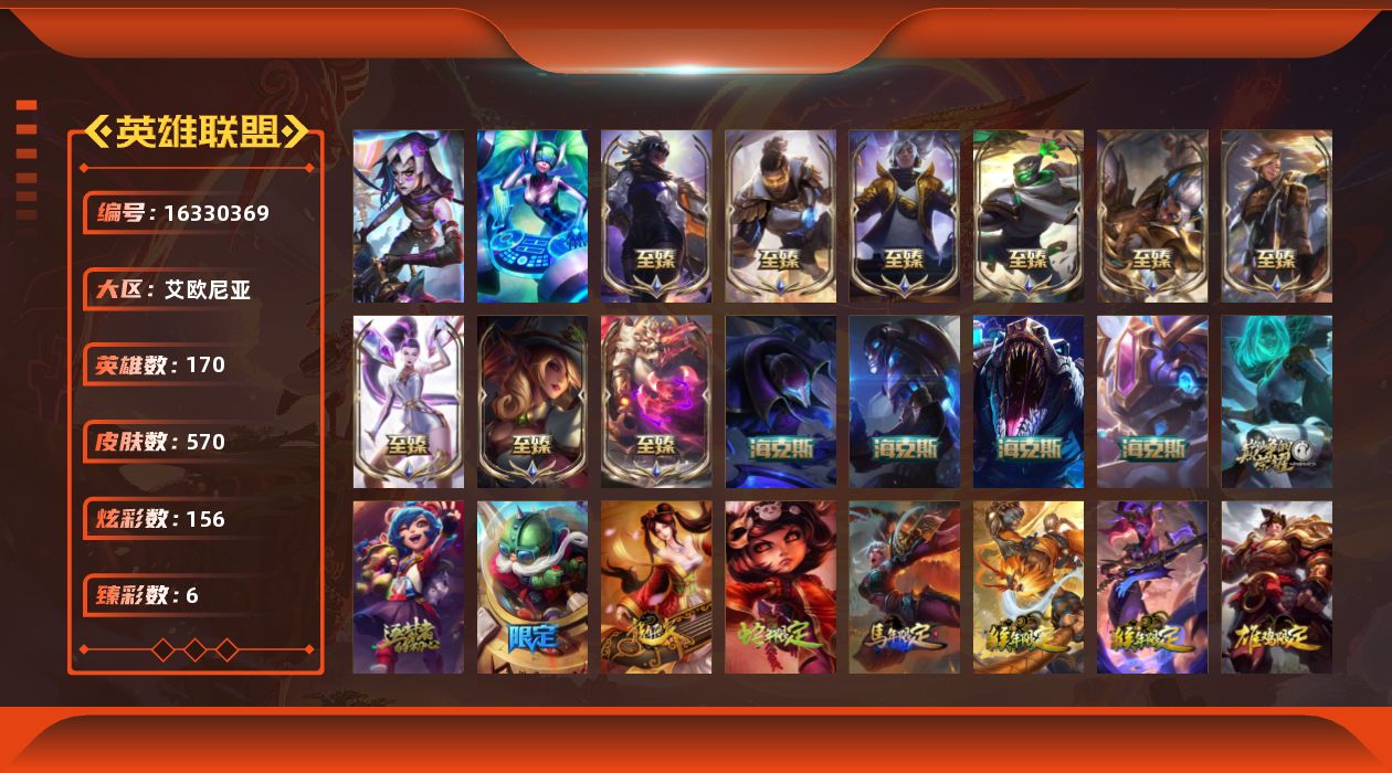 [16330369]未定级段位-170英雄-570皮肤-156炫彩-1终极-16神话-117限定-60传说-123史诗