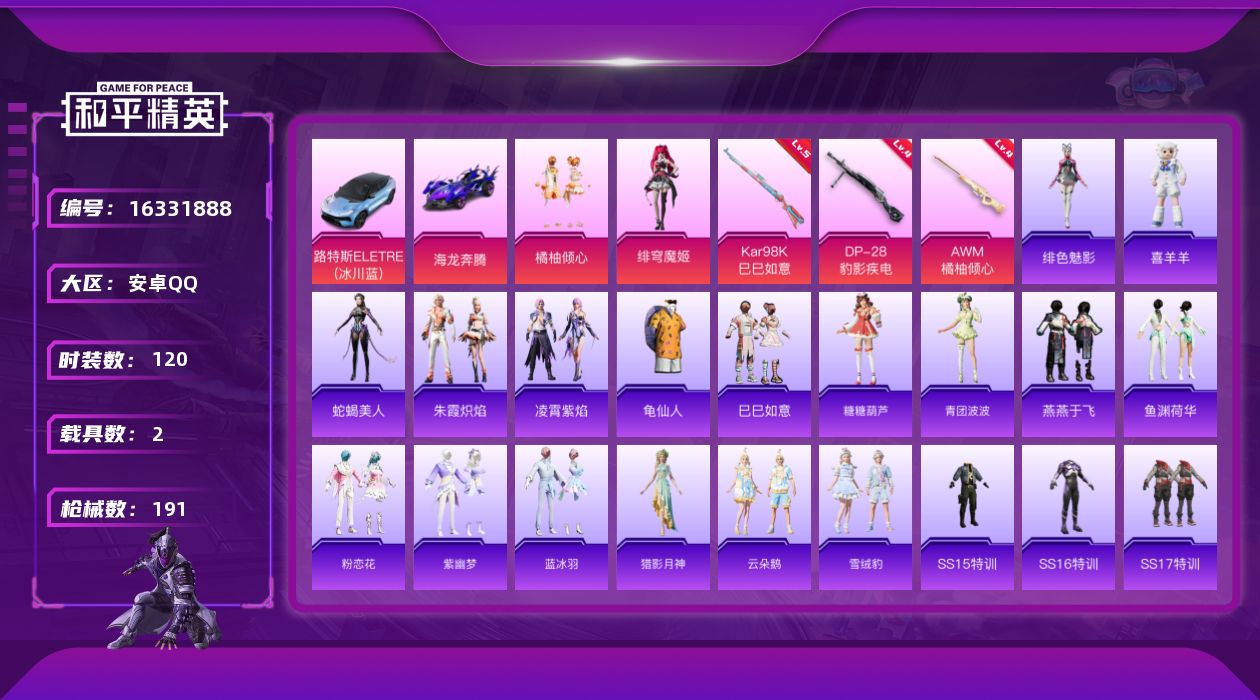 [16331888]安卓 手Q-2粉装-3特效枪-2载具-3粉色飞行器-57136热力值-13王牌印记-120套装-191枪皮【热门品类】:套装-龟仙人【粉色套装】:粉装-橘柚倾心,角色-绯穹魔姬【粉色枪皮等级】:Kar98K-巳巳如意(五级),AWM-橘柚倾心(四级),DP-28-豹影疾电(四级)【粉色载具】:路特斯ELETRE(冰川蓝),海龙奔腾【粉色枪皮】:Kar98K-巳巳如意,AWM-橘柚倾心,DP-28-豹影疾电【粉色飞行器】:庄周梦蝶飞行器,极意拳锋飞行器