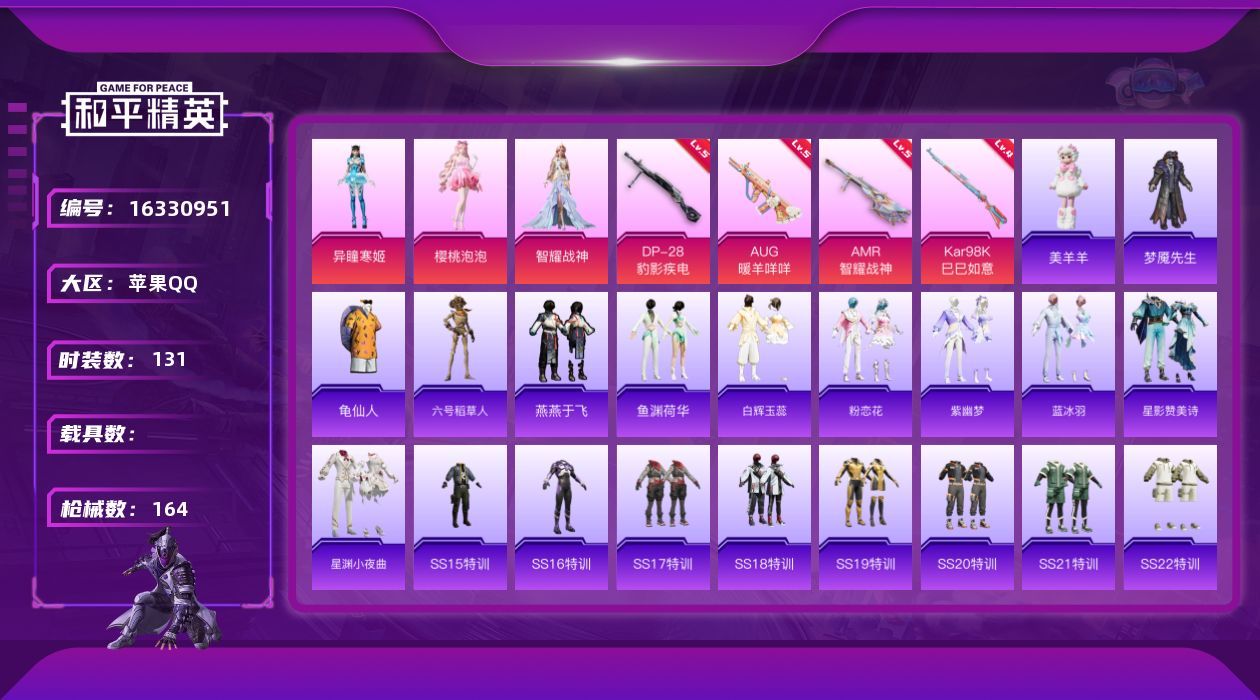 [16330951]【店主推荐捡漏号!可直接换绑】苹果 手Q-3粉装-4特效枪-0载具-3粉色飞行器-46283热力值-14王牌印记-131套装-164枪皮【热门品类】:套装-龟仙人,角色-六号稻草人【粉色套装】:角色-樱桃泡泡,角色-智耀战神,角色-异瞳寒姬【粉色枪皮等级】:AUG-暖羊咩咩(五级),Kar98K-巳巳如意(四级),AMR-智耀战神(五级),DP-28-豹影疾电(五级)【粉色枪皮】:AUG-暖羊咩咩,Kar98K-巳巳如意,AMR-智耀战神,DP-28-豹影疾电【粉色飞行器】:齐天大圣飞行器,戏水时光飞行器,绯果甜心飞行器