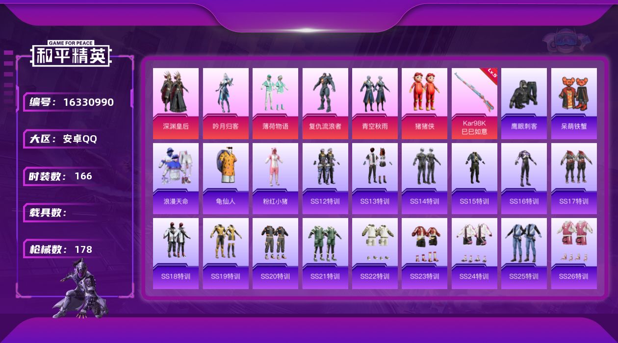 - PX_2111803- 苹果手Q-2王牌印记-4粉装-5特效枪-0载具-33089热力值-74套装-98枪皮-1卓越印记-0传奇印记 【4粉装】,冷漠罗丽,紫电风暴,炙焰牛王,绮梦青鸾 【5特效枪】SCAR-L-甜梦小狐-6级 GROZA-镜光银凌-5级 AUG-暖羊咩咩-5级 Kar98K-巳巳如意-5级 M24-暗星紫秘-5级 【2稀有紫装】,小丑鱼,龟仙人, 【74稀有时装】,SS31特训