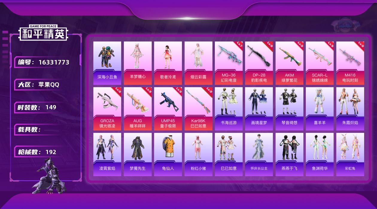 [16331773]【特价出售/店主推荐】苹果 手Q-3粉装-9特效枪-0载具-0粉色飞行器-59140热力值-12王牌印记-149套装-192枪皮【热门品类】:套装-深海小丑鱼,套装-龟仙人,套装-粉红小猪【粉色套装】:角色-歌者泠鸢,角色-烟云彩露,角色-羊梦糖心【粉色枪皮等级】:AKM-绿萝繁花(五级),SCAR-L-锦绣绵绵(五级),M416-电玩时刻(五级),GROZA-镜光银凌(五级),AUG-暖羊咩咩(五级),UMP45-量子极限(五级),Kar98K-巳巳如意(五级),DP-28-豹影疾电(五级),MG-36-幻彩电音(七级)【粉色枪皮】:AKM-绿萝繁花,SCAR-L-锦绣绵绵,M416-电玩时刻,GROZA-镜光银凌,AUG-暖羊咩咩,UMP45-量子极限,Kar98K-巳巳如意,DP-28-豹影疾电,MG-36-幻彩电音