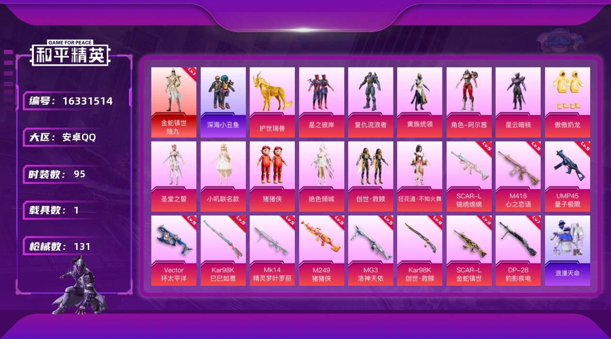 [16331514]安卓 手Q-1神装-12粉装-11特效枪-1载具-8粉色飞行器-49439热力值-4王牌印记-95套装-131枪皮 【红色神装等级】:金蛇镇世-烛九(一级) 【红色角色神装】:金蛇镇世-烛九 【热门品类】:套装-浪漫天命,套装-深海小丑鱼,角色-军刀雅典娜,角色-忠猛周仓,角色-忠真马岱,角色-忠义严颜,套装-龟仙人,套装-暗影哥特,角色-Mark.06,大砍刀-青龙偃月刀,撬棍-龙胆亮银枪 【粉色套装】:粉装-星之彼岸,角色-复仇流浪者,粉装-黄族统领,角色-阿尔茜,角色-星云暗核,粉装-傲傲奶龙,角色-圣堂之誓,角色-小叽联名款,玩偶服-猪猪侠,角色-绝色倾城,套装-创世·救赎,角色-狂花道·不知火舞 【粉色枪皮等级】:SCAR-L-锦绣绵绵(五级),SCAR-L-金蛇镇世(三级),M416-心之恋语(五级),UMP45-量子极限(五级),Vector-环太平洋(五级),Kar98K-创世·救赎(四级),Kar98K-巳巳如意(五级),Mk14-精灵梦叶罗丽(五级),M249-猪猪侠(五级),DP-28-豹影疾电(一级),MG3-洛神天依(五级) 【粉色载具】:护世瑞兽 【粉色枪皮】:SCAR-L-锦绣绵绵,SCAR-L-金蛇镇世,M416-心之恋语,UMP45-量子极限,Vector-环太平洋,Kar98K-创世·救赎,Kar98K-巳巳如意,Mk14-精灵梦叶罗丽,M249-猪猪侠,DP-28-豹影疾电,MG3-洛神天依 【粉色飞行器】:青春物语飞行器,黄族统领飞行器,祥瑞锦鲤飞行器,花傲天飞行器,镜域双华-灵镜之阶,绝色倾城飞行器,星空武士飞行器,万象金身飞行器 【粉色降落伞】:快乐主宰降落伞,星之彼岸降落伞,洛神天依降落伞,环太平洋降落伞,黄族统领降落伞,未来歌姬降落伞,猪猪侠降落伞,繁龙极客降落伞,绝色倾城降落伞,江南烟雨降落伞,精灵梦叶罗丽降落伞,创世·救赎降落伞,守护天翼降落伞,金蛇镇世降落伞,幻影飞狐降落伞,月下星之子降落伞 【稀有套装】:套装-龟仙人,套装-摩登天骄,套装-巳巳如意,套装-晶辉守护,套装-旋风灵鼠 【稀有枪皮】:AKM-影袭,AKM-环太平洋,AKM-霓虹街区,AKM-龙的传人,M16A4-莲影清波,SCAR-L-幽秘魅影,SCAR-L-是爱神辣,M416-动感兔斯基,M416-糯团青竹,M416-绯红前夜,M416-蓝色火焰