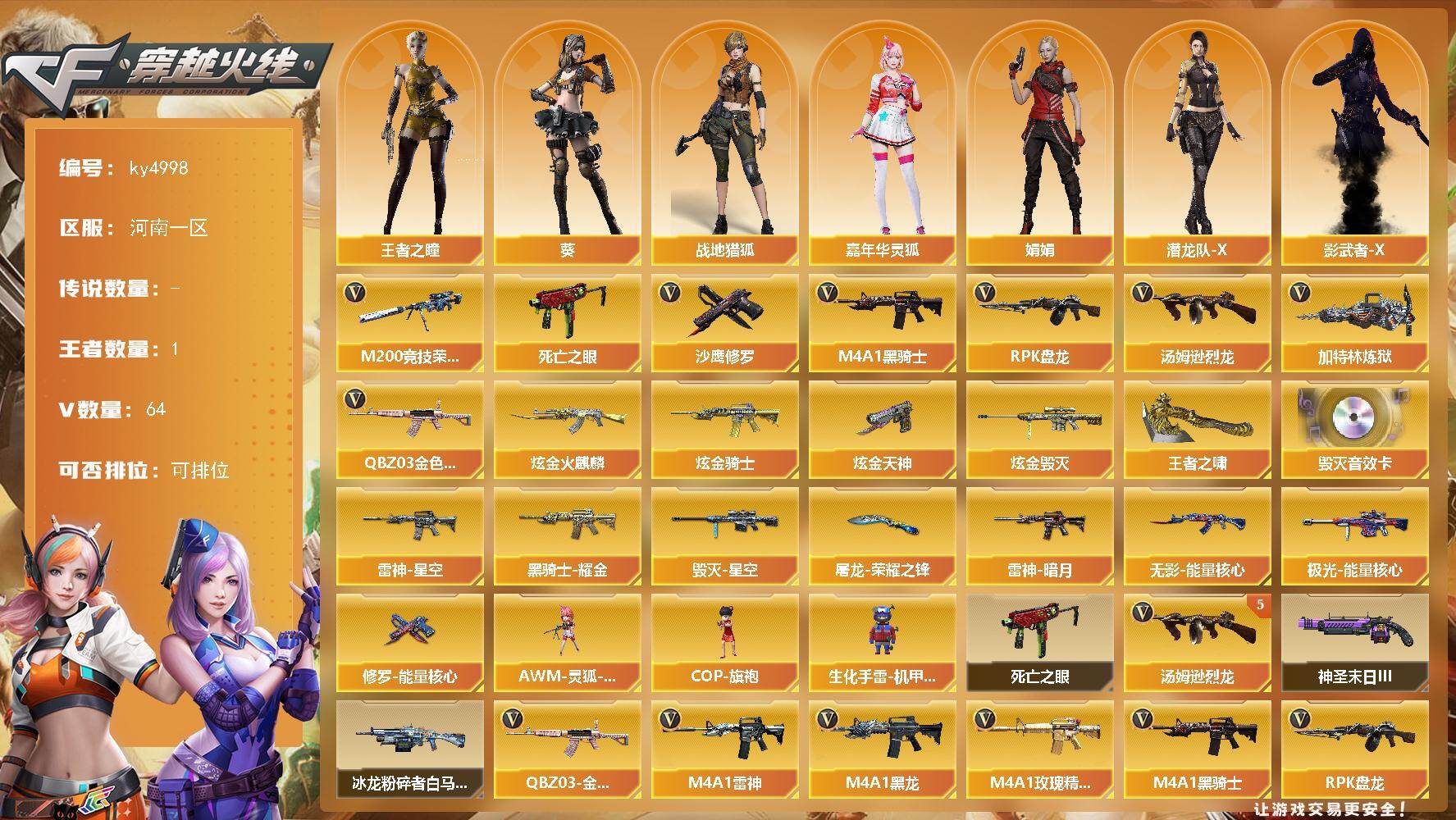[16331182]河南一区-64V-1王者-4炫金 【热门武器】:QBZ03-金色蔷薇*3,M200-竞技荣光,死亡之眼,M4A1-黑骑士*2,汤姆逊-烈龙*5,RPK-盘龙*4,加特林-炼狱*3,沙鹰-修罗*4 【王者炫金武器】:王者之啸,炫金火麒麟,炫金骑士,炫金毁灭,炫金天神 【音效卡】:Barrett-毁灭音效卡 【皮肤】:雷神-暗月,雷神-星空,毁灭-星空,黑骑士耀金皮肤,无影-能量核心,极光-能量核心,修罗-能量核心,屠龙-荣耀之锋 【角色】:葵,战地猎狐,王者之瞳,嘉年华灵狐,娟娟,潜龙队-X,影武者-X 【人偶武器】:AWM-灵狐-15周年嘉年华,COP-旗袍,生化手雷-机甲核心*2 【暴走生化】:死亡之眼 【挑战大师】:冰龙粉碎者-白马银枪,神圣爆裂者-末日III 【英雄级武器】:M4A1-千变*2,AK47-火麒麟,M4A1-黑龙*2,M4A1-雷神*3,M4A1-黑骑士*2,AK47-无影,AN94-超新星*3,M4A1-武圣,无影-神兵利器,M4A1-玫瑰精灵,QBZ03-金色蔷薇*3,AK-47-猩红传说,AWM-天龙,Barrett-毁灭*2,Barrett-极光,AWM-裁决,M200-竞技荣光,RPK-盘龙*4,加特林-炼狱*3,汤姆逊-烈龙*5,沙鹰-修罗*4,Glock18-武圣,屠龙*2,龙啸,擎天,麒麟刺,高爆手雷-雷霆,高爆手雷-竞技荣光*3,闪光弹-雷霆,闪光弹-竞技荣光*2,烟雾弹-雷霆,烟雾弹-竞技荣光*2,M4A1-赤狱骑士 【道具】:BS战队炫彩背包,亚洲杯纪念炫彩背包,全能枪王背包,冰冰企鹅背包-猛男专用,炫彩背包,女皇终结者-魔龙之吻,救世主-黑桃战神,绿色巨人,灵魂忍者,变异宝贝,迷雾幽灵,夺命之镰,防化服*3,金色流光-枪王排位*2,枪王排位29赛季金色流光,防弹头盔*5,防弹衣*5,C4工具钳*4,手雷包*4 【特殊枪械】:2黑骑士,5烈龙,4盘龙,3炼狱