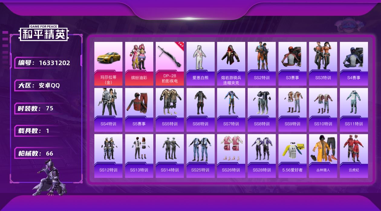 [16331202]【店主推荐捡漏号!可直接换绑】安卓 手Q-1粉装-1特效枪-1载具-1粉色飞行器-22658热力值-3王牌印记-75套装-66枪皮【热门品类】:粉装-缤纷油彩,旭日初心兜帽大衣,熔岩游骑兵连帽夹克【粉色套装】:粉装-缤纷油彩【粉色枪皮等级】:DP-28-豹影疾电(一级)【粉色载具】:玛莎拉蒂Ghibli(金)【粉色枪皮】:DP-28-豹影疾电