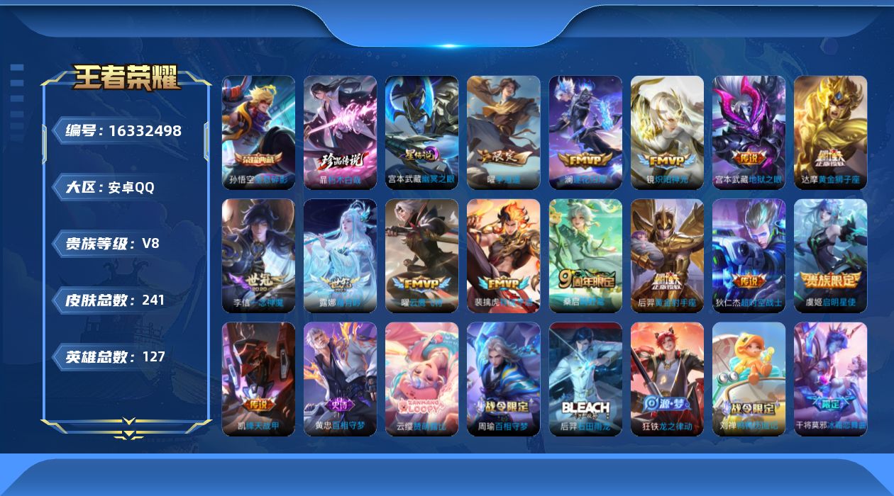 [16332498]安卓Q--241皮肤-1典藏皮肤-1珍品传说-14传说-72史诗 【英雄全皮】:空空儿全皮 【荣耀典藏】:孙悟空全息碎影 【珍品传说】:暃朽木白哉 【传说皮肤】:裴擒虎祥瑞亨通,桑启鸣野蒿,澜逐花归海,露娜霜月吟,曜李逍遥 ,铠绛天战甲,镜炽阳神光,虞姬启明星使,曜云鹰飞将,李信一念神魔,达摩黄金狮子座,后羿黄金射手座,宫本武藏地狱之眼,狄仁杰超时空战士 【限定皮肤】:姜子牙天穹之誓,狄仁杰阴阳师,赵云皇家上将,庄周高山流水,高渐离玩趣恶龙,吕布御风骁将,元歌云间偶戏,元歌无心,夏侯惇朔风刀,马可波罗山海玄木吟,狄仁杰魔术师,狄仁杰万华元夜,达摩沙漠行僧,项羽海滩派对,老夫子醍醐杖,程咬金演武夺筹,韩信飞衡,兰陵王金庭之子,亚瑟潮玩骑士王,孙悟空孙行者,牛魔御旌,李元芳云中旅人,虞姬启明星使,钟馗驱傩正仪,干将莫邪冰霜恋舞曲,雅典娜单词大作战,雅典娜黎明之约,鬼谷子原初探秘者,鬼谷子五谷丰年,苏烈千军破阵,百里玄策原初追逐者,百里守约朱雀志,弈星混沌棋,梦奇顽趣,沈梦溪大漠名商,明世隐疑决卦,裴擒虎李小龙,裴擒虎擒涛扼浪,盾山御銮,猪八戒猪悟能,曜李逍遥 ,蒙犽狂想玩偶喵,鲁班大师探海日志,桑启海盐诗旅,艾琳女武神,张良古海寻踪,蒙恬荣光圣徽,鬼谷子天穹祈灯,刘邦剑破天穹,周瑜熔金海岸 【年限皮肤】:百里守约朱雀志,韩信飞衡,吕布御风骁将,马可波罗山海玄木吟 【赛季限定】:牛魔御旌,盾山御銮,夏侯惇朔风刀,弈星混沌棋,明世隐疑决卦,老夫子醍醐杖,鬼谷子原初探秘者,狄仁杰万华元夜,程咬金演武夺筹,钟馗驱傩正仪,苏烈千军破阵,达摩沙漠行僧,兰陵王金庭之子,沈梦溪大漠名商,李元芳云中旅人,桑启海盐诗旅,裴擒虎擒涛扼浪,鲁班大师探海日志,张良古海寻踪,鬼谷子天穹祈灯,刘邦剑破天穹,姜子牙天穹之誓,东皇太一噬灭天穹,太乙真人谧流熔炉,钟馗虚灵犬护,甄姬逆浪荇歌,亚瑟荣光之誓,百里玄策原初追逐者,雅典娜黎明之约,梦奇顽趣,蒙恬荣光圣徽 【战令限定】:蒙犽狂想玩偶喵,雅典娜单词大作战,元歌云间偶戏,亚瑟潮玩骑士王,刘禅鸭鸭历险记,沈梦溪鸭鸭历险记,周瑜百相守梦,孙策百相守梦 【史诗皮肤】:鲁班七号电玩小子,阿轲暗夜猫娘,赵云皇家上将,赵云未来纪元,貂蝉圣诞恋歌,甄姬冰雪圆舞曲,王昭君偶像歌手,狄仁杰魔术师,廉颇地狱岩魂,宫本武藏鬼剑武藏,孙尚香水果甜心,嬴政暗夜贵公子,嬴政摇滚