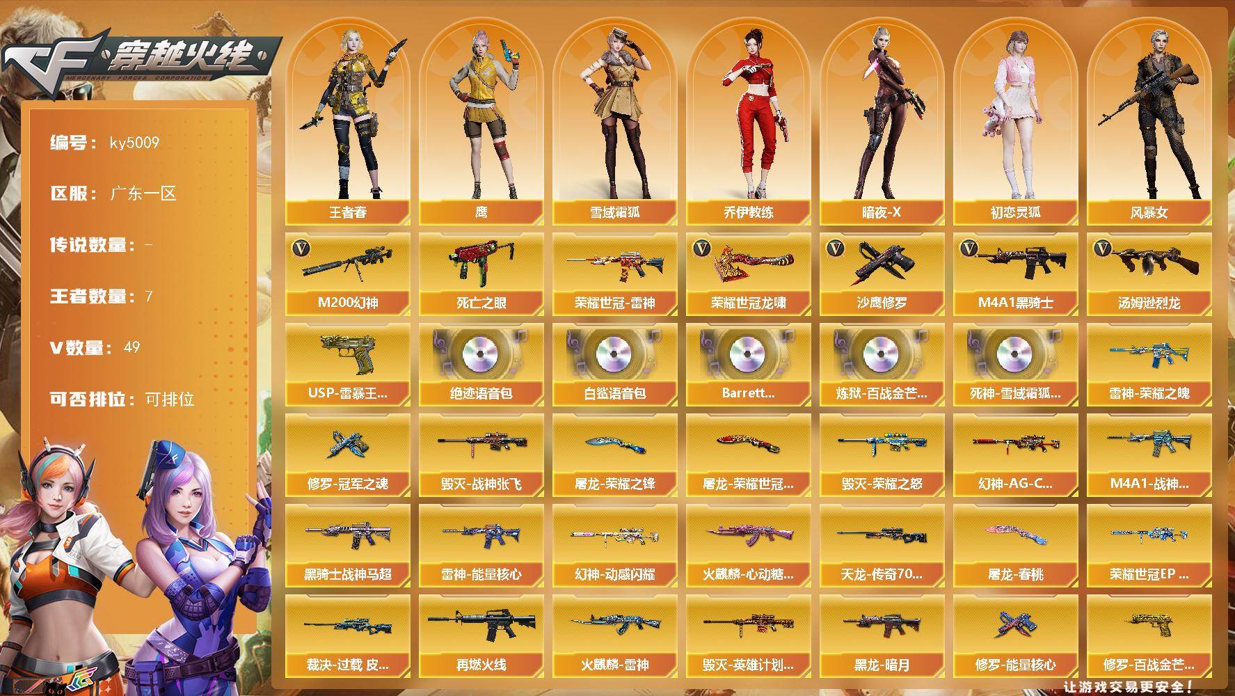[16331322]广东一区-49V-7王者-0炫金 【热门武器】:M200-幻神,死亡之眼*2,荣耀世冠-雷神,M4A1-黑骑士,汤姆逊-烈龙*3,沙鹰-修罗*4,荣耀世冠-龙啸 【王者炫金武器】:USP-雷暴王者 【音效卡】:绝迹语音包,白鲨语音包,Barrett-碧霄极光音效卡,炼狱-百战金芒-庆典舞曲音效卡,死神-雪域霜狐-怀旧音效卡 【皮肤】:幻神-AG-CFPLS17冠军,幻神-动感闪耀 皮肤,幻神-荣耀世冠EP 皮肤,幻神-电竞之星 皮肤,裁决-过载 皮肤,雷神-能量核心,雷神-荣耀之魄,M4A1-战神赵云,M4A1-再燃火线,火麒麟-雷神,火麒麟-心动糖果,毁灭-荣耀之怒,毁灭-战神张飞,毁灭-英雄计划 皮肤,黑龙-暗月,黑骑士-战神马超,AWM-天龙-传奇70KG,修罗-能量核心*2,修罗-冠军之魂,修罗-百战金芒 皮肤,屠龙-荣耀之锋,屠龙-荣耀世冠AG,屠龙-春桃 皮肤,屠龙-巅峰荣耀 皮肤,轻型军用手斧-再燃火线,龙啸-青青莓果 皮肤 【角色】:鹰,妮妮,王者春,雪域霜狐,乔伊教练,暗夜-X,初恋灵狐,风暴女,娟娟,灵狐者-黄金海岸,麻雀,潘多拉-甜心教官,斯沃特-X,新娜塔莎,雪莉杨-摸金校尉,影武者-X 【人偶武器】:迷你救赎猎手,AWM-灵狐-15周年嘉年华,生化手雷-机甲核心,迷你深渊冰龙-王绿豆 【暴走生化】:死亡之眼*2 【英雄级武器】:AK47-火麒麟*2,M4A1-黑龙,M4A1-雷神,M4A1-黑骑士,死神-雪域霜狐,AK-47-猩红传说*2,荣耀世冠-雷神,加利尔ACE-天袭,Barrett-毁灭,Barrett-极光,AWM-裁决,M200-幻神,王者之怒-觉醒版,炼狱-百战金芒,汤姆逊-烈龙*3,沙鹰-修罗*4,王者之魂-觉醒版,屠龙,龙啸,擎天,荣耀世冠-龙啸,麒麟刺-百战金芒,丛林匕首-玄豹,高爆手雷-神工天巧*2,高爆手雷-玄豹,闪光弹-雷暴,闪光弹-神工天巧,闪光弹-玄豹,烟雾弹-玄豹,烟雾弹-荣耀世冠EP,M4A1-苍鸣雷神,Barrett-碧霄极光 【道具】:BS战队炫彩背包,CFS限定背包,云山科技背包,亚洲杯纪念炫彩背包,女皇终结者-背包,百战金芒炫彩背包,超级背包,雪域霜狐炫彩背包,女皇终结者-魔龙之吻,救世主-黑桃战神,绿色巨人,灵魂忍者*2,变异宝贝,迷雾幽灵*2,夺命之镰,防化服*3,金色流光-枪王排位*2,星辰