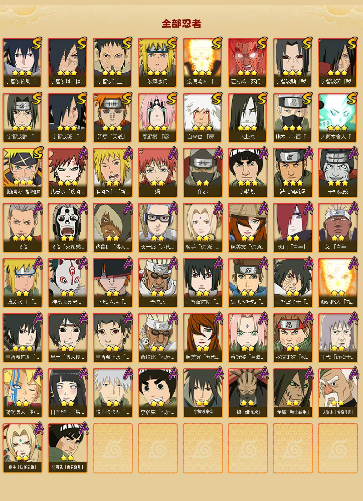 【S级忍者】:宇智波鼬「秽土转生」(3星),宇智波斑「秽土转生」(3星),宇智波斑「秽土转生·解」(3星),春野樱「忍界大战」(3星),宇智波带土「忍界大战」(3星),宇智波鼬「须佐能乎」(3星),旗木卡卡西「须佐能乎」(3星),宇智波斑「木叶创立」(3星),自来也「舞之豪杰」(3星),大蛇丸(3星),波风水门(3星),漩涡鸣人「九喇嘛连结」(3星),迈特凯「死门」(3星),佩恩「天道」(3星),宇智波佐助「永恒万花筒」(3星),大筒木舍人「最终章」(3星),漩涡鸣人·宇智波佐助(3星)
