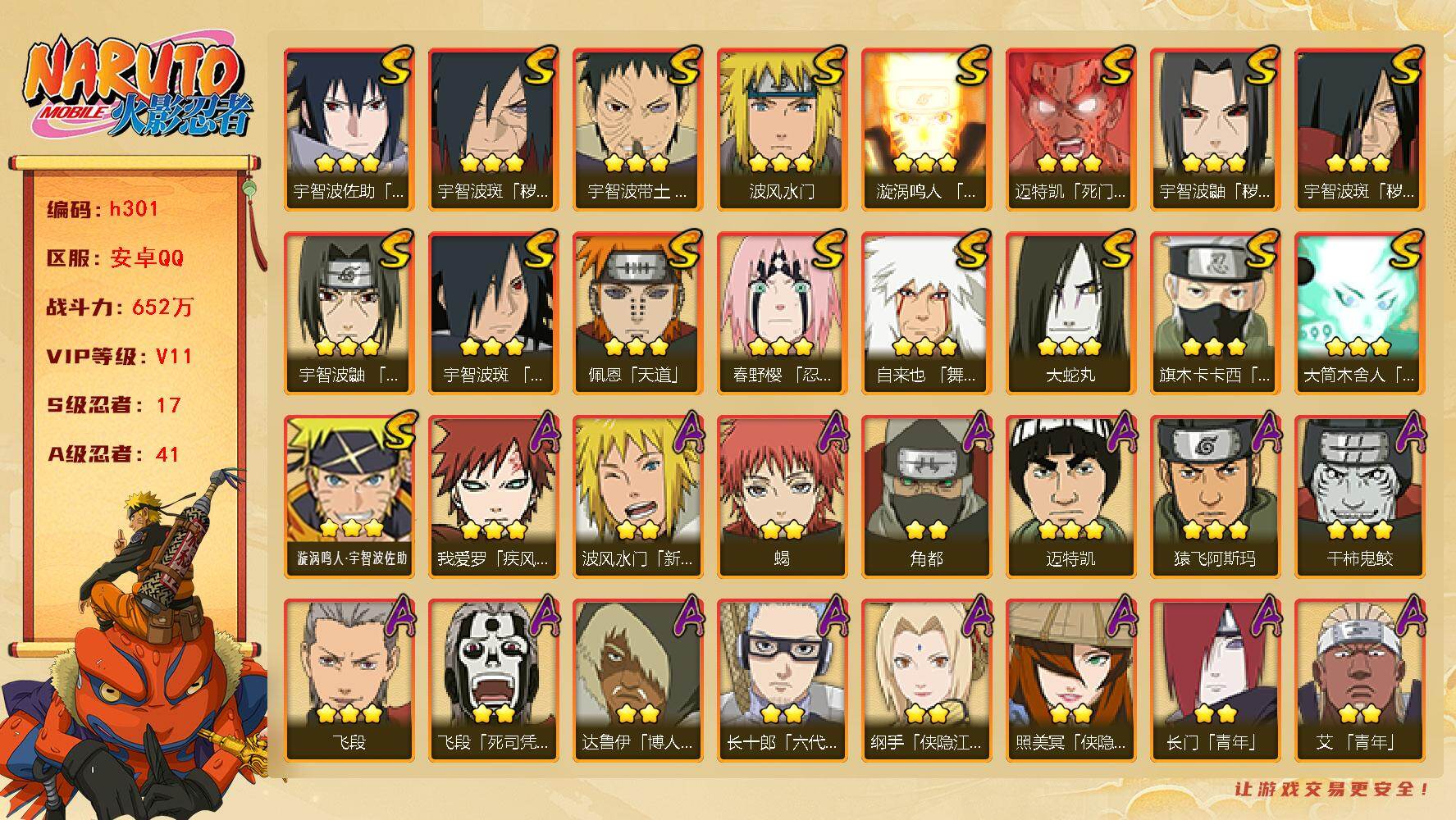 【A级忍者】:艾「青年」(2星),长门「青年」(2星),波风水门「青年」(2星),波风水门「新春限定」(2星),达鲁伊「博人传」(2星),奇拉比(2星),奇拉比「忍界大战」(2星),飞段(3星),飞段「死司凭血」(2星),干柿鬼鲛(3星),漩涡博人「桃式显现」(2星),漩涡鸣人「九尾查克拉」(2星),迈特凯(3星),旗木卡卡西「幻之真容」(2星),我爱罗「疾风传」(3星),蝎(2星),蝎「绯流琥」(2星),角都(2星),角都「秽土转生」(2星),猿飞阿斯玛(3星),宇智波止水「新春限定」(2星),宇智波佐助「须佐能乎」(3星),宇智波佐助「万花筒写轮眼」(2星),照美冥「侠隐江湖」(2星),照美冥「五代目水影」(2星),日向雏田「最终章」(2星),宇智波带土「暴怒」(2星),长十郎「六代目水影」(2星),纲手「侠隐江湖」(2星),神秘面具男「忍者之路」(2星),佩恩·六道「漂泊浪客」(2星),李洛克「忍界大战」(2星),猿飞木叶丸「博人传」(2星),黑土「博人传」(2星),春野樱「百豪」(2星),秋道丁次「忍界大战」(2星),千代「近松十人卫」(2星),宇智波泉奈(2星),大野木「侠隐江湖」(2星),纲手「妖怪奇谭」(2星),迈特凯「青春爆炸」(2星)