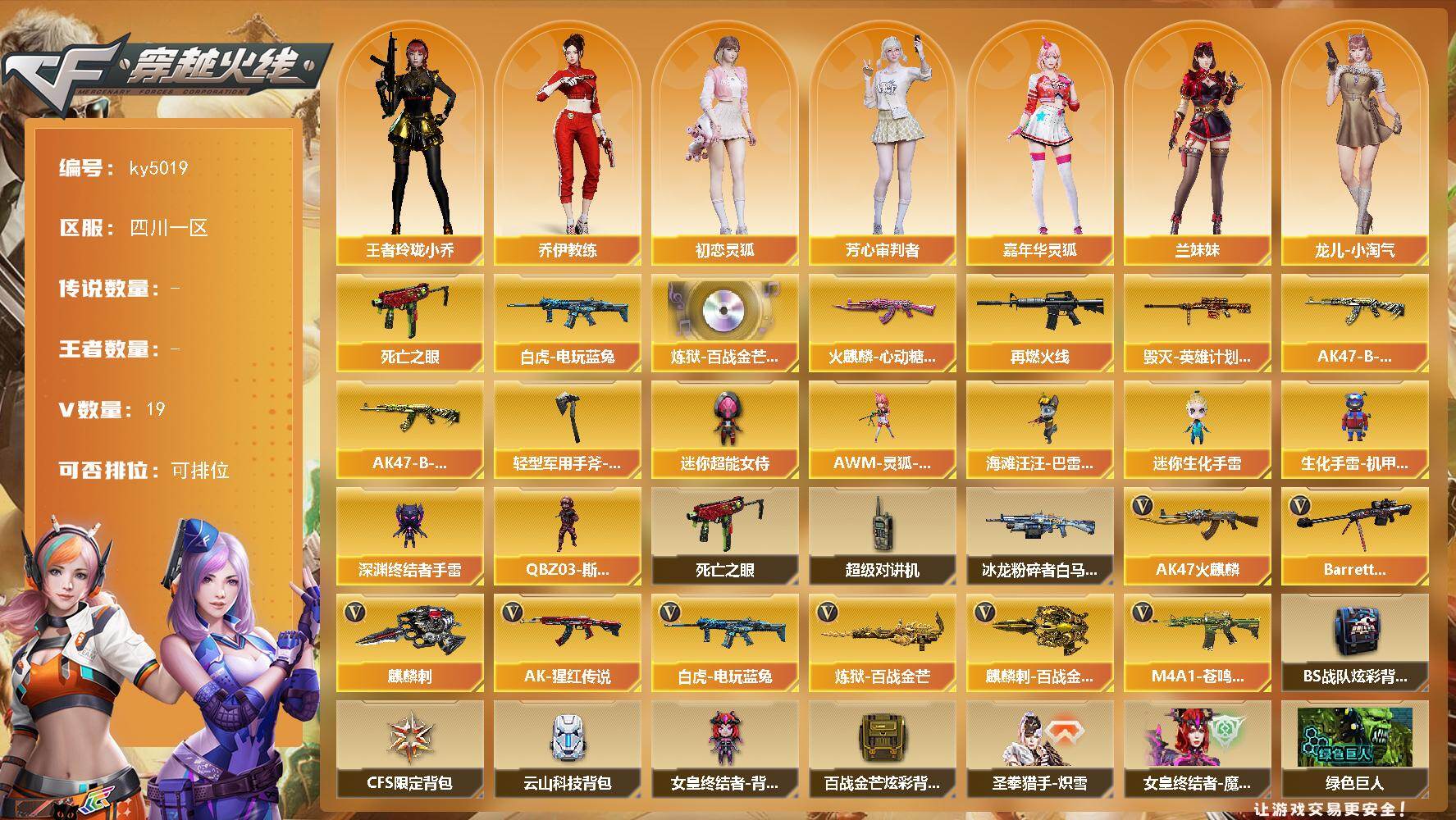 [16331509]四川一区-19V-0王者-0炫金 【热门武器】:死亡之眼,白虎-电玩蓝兔 【音效卡】:炼狱-百战金芒-庆典舞曲音效卡 【皮肤】:M4A1-再燃火线,火麒麟-心动糖果,毁灭-英雄计划 皮肤,AK47-B-常胜将军-刘备,AK47-B-常胜将军-孙权*2,轻型军用手斧-再燃火线 【角色】:王者玲珑-小乔,乔伊教练,初恋灵狐,芳心审判者,嘉年华灵狐,兰妹妹,龙儿-小淘气,斯沃特-X,雪莉杨 【人偶武器】:AWM-灵狐-15周年嘉年华*2,海滩汪汪-巴雷特,迷你生化手雷,生化手雷-机甲核心*2,深渊终结者手雷,迷你超能女侍,QBZ03-斯沃特 【暴走生化】:死亡之眼,超级对讲机 【挑战大师】:冰龙粉碎者-白马银枪 【英雄级武器】:AK47-火麒麟*2,AK-47-猩红传说,白虎-电玩蓝兔,Barrett-毁灭,炼狱-百战金芒,麒麟刺,麒麟刺-百战金芒,M4A1-苍鸣雷神 【道具】:BS战队炫彩背包,CFS限定背包,云山科技背包,女皇终结者-背包,百战金芒炫彩背包,圣拳猎手-炽雪,女皇终结者-魔龙之吻,黄金生化钩,绿色巨人,灵魂忍者,迷雾幽灵,夺命之镰,防化服*3,金色流光-枪王排位,星辰流光-枪王排位,语音特效-盛典烟火,萌萌小葵表情,电玩兔兔表情,防弹头盔*3,防弹衣*3,C4工具钳*3,手雷包*3 【特殊枪械】: