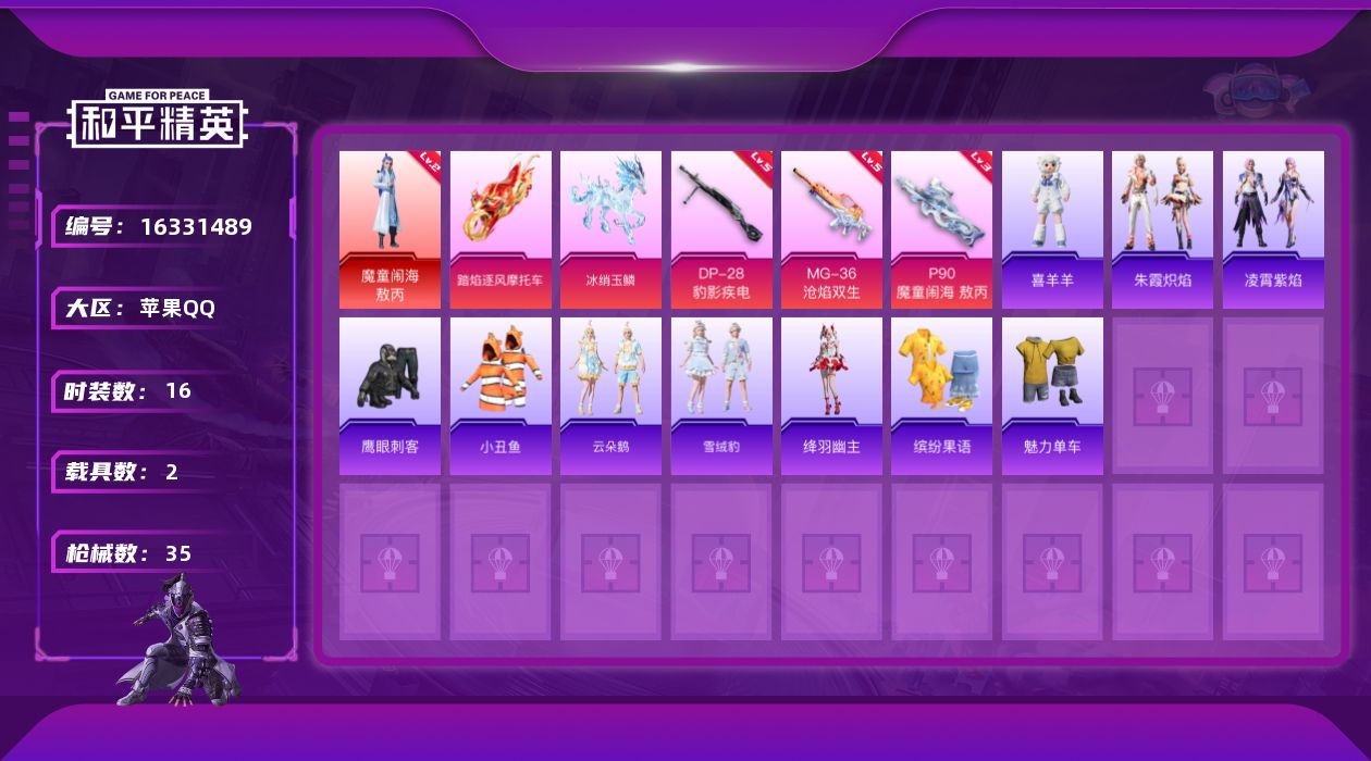 [16331489]【特价出售/店主推荐】苹果 手Q-1神装-0粉装-3特效枪-2载具-2粉色飞行器-13070热力值-2王牌印记-16套装-35枪皮 【红色神装等级】:魔童闹海-敖丙(二级) 【红色角色神装】:魔童闹海-敖丙 【热门品类】:套装-小丑鱼 【粉色枪皮等级】:P90-魔童闹海 敖丙(三级),DP-28-豹影疾电(五级),MG-36-沧焰双生(五级) 【粉色载具】:踏焰逐风摩托车,冰绡玉鳞 【粉色枪皮】:P90-魔童闹海 敖丙,DP-28-豹影疾电,MG-36-沧焰双生 【粉色飞行器】:灵珠游龙飞行器 【粉色降落伞】:第五大道降落伞,冷漠罗丽降落伞,魔童闹海 敖丙降落伞 【稀有套装】:套装-云朵鹅,套装-雪绒豹,角色-绛羽幽主,套装-朱霞炽焰,套装-凌霄紫焰,玩偶服-喜羊羊 【稀有枪皮】:M16A4-最终圣卫者,GROZA-影袭,M762-云朵鹅,ARX-凌霄紫焰,UMP45-生命誓言,JS9-凌霄紫焰,Kar98K-影袭,M24-影袭,AMR-喜羊羊与灰太狼,SVD-云朵鹅,DBS-第五大道,SPAS-12-云朵鹅,M249-糯团青竹,MG3-第五大道,MG-36-凌霄紫焰,P92-凌霄紫焰,沙漠之鹰-云朵鹅,爆炸猎弓-喜羊羊与灰太狼,大砍刀-云朵鹅,撬棍-冷漠罗丽,平底锅-凌霄紫焰 【其他套装】:套装-缤纷果语,套装-魅力单车,套装-鹰眼刺客 【稀有背包】:深海小丑鱼背包(2级) 【营地ID】:1007640806