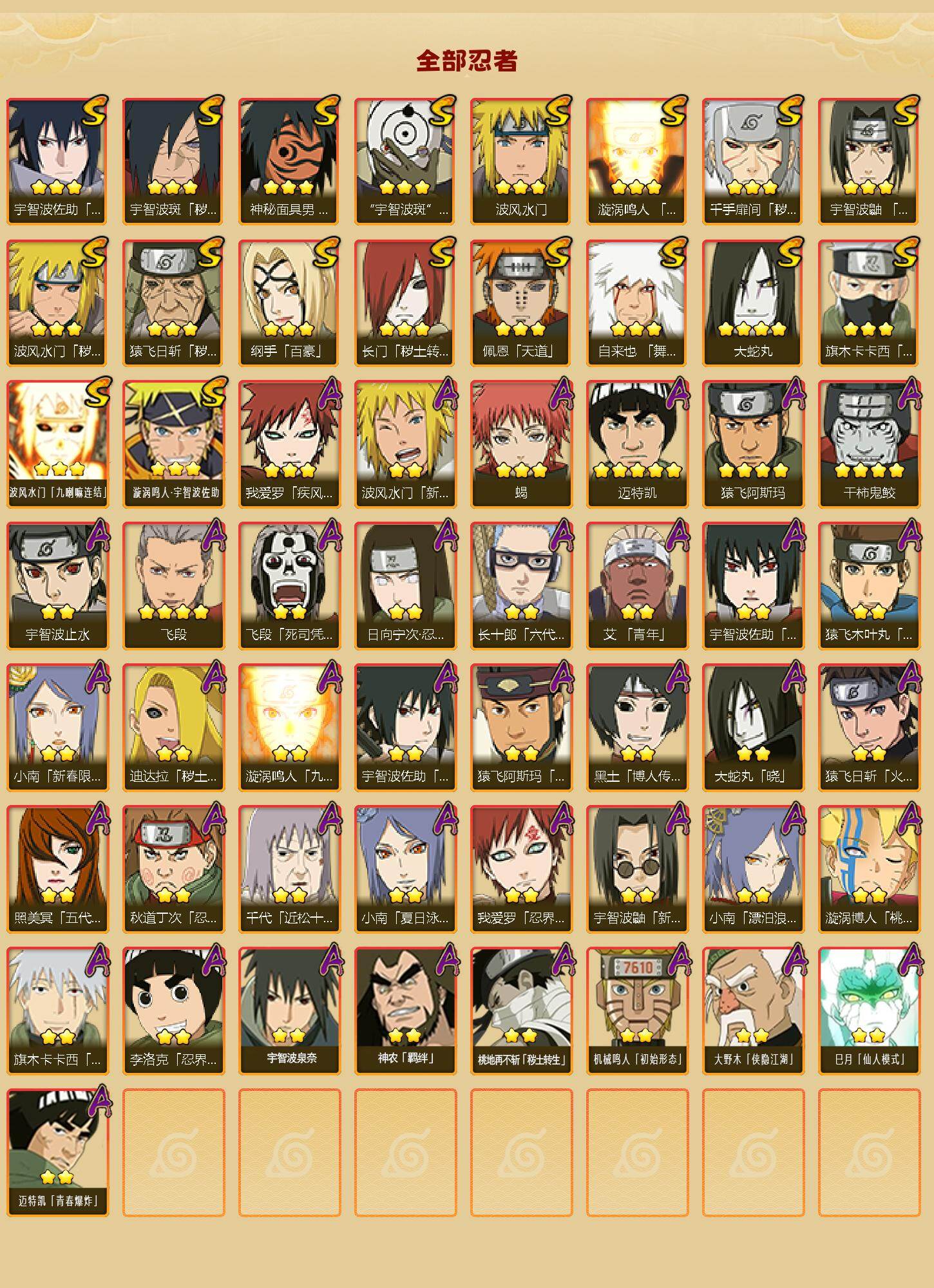【A级忍者】:艾「青年」(2星),波风水门「新春限定」(2星),迪达拉「秽土转生」(2星),大蛇丸「晓」(2星),飞段(4星),飞段「死司凭血」(2星),干柿鬼鲛(4星),漩涡博人「桃式显现」(2星),漩涡鸣人「九尾查克拉」(2星),机械鸣人「初始形态」(2星),迈特凯(5星),旗木卡卡西「幻之真容」(2星),桃地再不斩「秽土转生」(2星),我爱罗「疾风传」(3星),我爱罗「忍界大战」(2星),蝎(3星),小南「新春限定」(2星),小南「夏日泳装」(2星),小南「漂泊浪客」(2星),猿飞阿斯玛(4星),猿飞阿斯玛「七夕限定」(2星),宇智波止水(2星),猿飞日斩「火影继承人」(2星),宇智波鼬「新春限定」(2星),宇智波佐助「须佐能乎」(2星),宇智波佐助「万花筒写轮眼」(2星),照美冥「五代目水影」(2星),日向宁次「忍界大战」(2星),长十郎「六代目水影」(2星),李洛克「忍界大战」(2星),猿飞木叶丸「博人传」(2星),黑土「博人传」(2星),秋道丁次「忍界大战」(2星),千代「近松十人卫」(2星),神农「羁绊」(2星),宇智波泉奈(2星),大野木「侠隐江湖」(2星),巳月「仙人模式」(2星),迈特凯「青春爆炸」(2星)