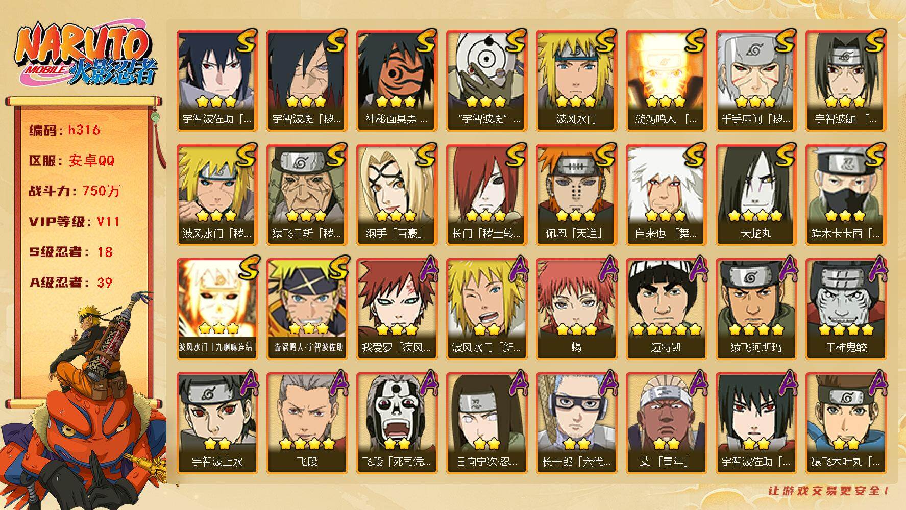 [16332035]18S级忍者数-39A级忍者数 【S级忍者】:长门「秽土转生」(3星),猿飞日斩「秽土转生」(3星),波风水门「秽土转生」(3星),千手扉间「秽土转生」(3星),宇智波斑「秽土转生·解」(3星),宇智波鼬「须佐能乎」(3星),旗木卡卡西「须佐能乎」(3星),自来也「舞之豪杰」(3星),大蛇丸(4星),纲手「百豪」(3星),波风水门(3星),神秘面具男「红夜之刃」(3星),漩涡鸣人「九喇嘛连结」(3星),佩恩「天道」(3星),宇智波佐助「永恒万花筒」(3星),宇智波斑 「白面具」(3星宇智波斑「白面具」),波风水门「九喇嘛连结」(3星),漩涡鸣人·宇智波佐助(3星) 【A级忍者】:艾「青年」(2星),波风水门「新春限定」(2星),迪达拉「秽土转生」(2星),大蛇丸「晓」(2星),飞段(4星),飞段「死司凭血」(2星),干柿鬼鲛(4星),漩涡博人「桃式显现」(2星),漩涡鸣人「九尾查克拉」(2星),机械鸣人「初始形态」(2星),迈特凯(5星),旗木卡卡西「幻之真容」(2星),桃地再不斩「秽土转生」(2星),我爱罗「疾风传」(3星),我爱罗「忍界大战」(2星),蝎(3星),小南「新春限定」(2星),小南「夏日泳装」(2星),小南「漂泊浪客」(2星),猿飞阿斯玛(4星),猿飞阿斯玛「七夕限定」(2星),宇智波止水(2星),猿飞日斩「火影继承人」(2星),宇智波鼬「新春限定」(2星),宇智波佐助「须佐能乎」(2星),宇智波佐助「万花筒写轮眼」(2星),照美冥「五代目水影」(2星),日向宁次「忍界大战」(2星),长十郎「六代目水影」(2星),李洛克「忍界大战」(2星),猿飞木叶丸「博人传」(2星),黑土「博人传」(2星),秋道丁次「忍界大战」(2星),千代「近松十人卫」(2星),神农「羁绊」(2星),宇智波泉奈(2星),大野木「侠隐江湖」(2星),巳月「仙人模式」(2星),迈特凯「青春爆炸」(2星) 【角色时装】:小南「漂泊浪客」-晨昏神使 【通灵兽】:熊猫