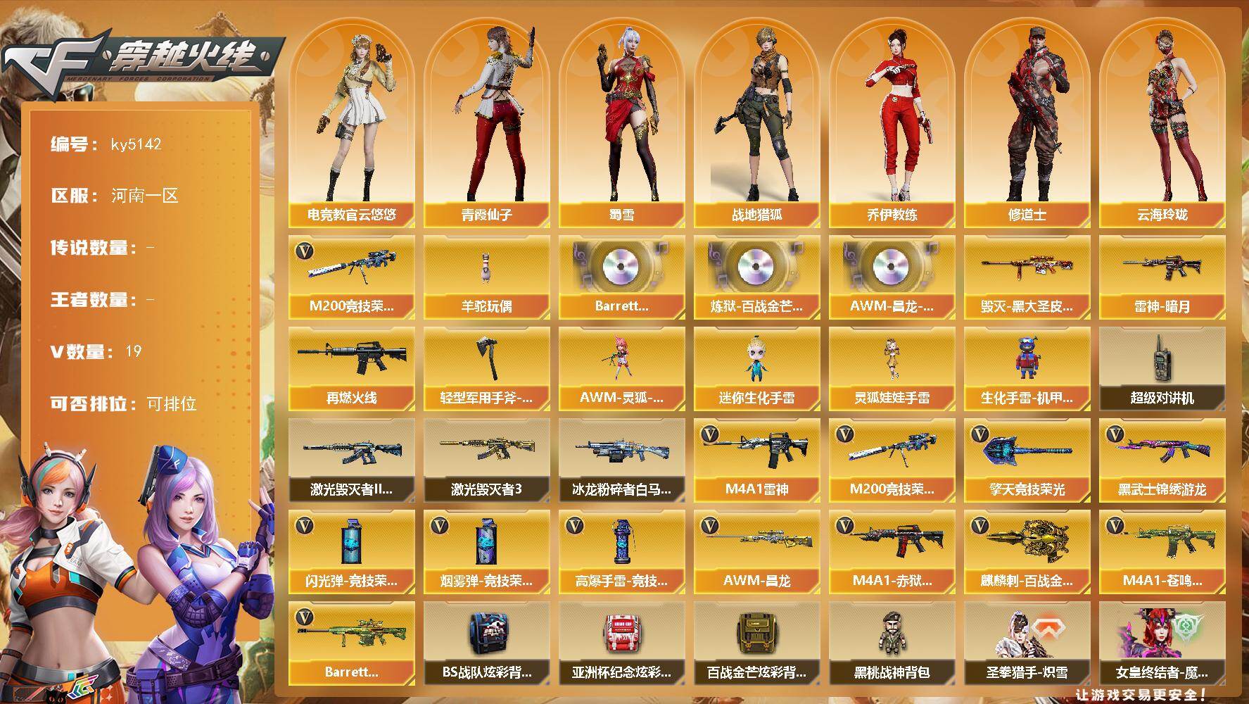 [16333258]河南一区-19V-0王者-0炫金 【热门武器】:M200-竞技荣光,羊驼玩偶 【音效卡】:Barrett-碧霄极光音效卡,炼狱-百战金芒-庆典舞曲音效卡,AWM-昌龙-怀旧音效卡 【皮肤】:雷神-暗月,M4A1-再燃火线,毁灭-黑大圣皮肤,轻型军用手斧-再燃火线 【角色】:电竞教官-云悠悠,战地猎狐,奇洋探员,乔伊教练,修道士,云海玲珑,暗夜-X,北极狐-X,电竞少女,飞虎队-X,风暴女,疾风,娟娟,兰妹妹,猎狐者-追月,灵狐者-X,灵狐者-黄金海岸,龙儿,曼陀罗-X,曼陀罗-礼服,玫瑰花神,萌儿,娜塔莉娅,潘多拉-X,潘多拉-甜心教官,青霞仙子,斯沃特-X,蜀雪,兔囡囡,维纳斯,夜玫瑰-宠粉,樱-战斗天使,游珑儿,智影 【人偶武器】:AWM-灵狐-15周年嘉年华,迷你生化手雷,生化手雷-机甲核心,灵狐娃娃手雷 【暴走生化】:超级对讲机 【挑战大师】:冰龙粉碎者-白马银枪*2,激光毁灭者III-白马银枪,激光毁灭者III 【英雄级武器】:M4A1-雷神,黑武士-锦绣游龙,M200-竞技荣光,擎天-竞技荣光,麒麟刺-百战金芒,高爆手雷-竞技荣光*2,闪光弹-竞技荣光*2,烟雾弹-竞技荣光*2,M4A1-赤狱骑士,M4A1-苍鸣雷神,AWM-昌龙,Barrett-碧霄极光 【道具】:BS战队炫彩背包,亚洲杯纪念炫彩背包,百战金芒炫彩背包,黑桃战神背包,圣拳猎手-炽雪,女皇终结者-魔龙之吻,救世主-黑桃战神,绿色巨人,灵魂忍者*2,变异宝贝,迷雾幽灵*2,夺命之镰,防化服*3,星辰流光-枪王排位,流光-再燃火线,枪王排位28赛季金色流光,枪王排位29赛季金色流光,语音特效-盛典烟火,萌萌小葵表情,C4-再燃火线,防弹头盔*3,防弹衣*3,C4工具钳*3,手雷包*2 【特殊枪械】: