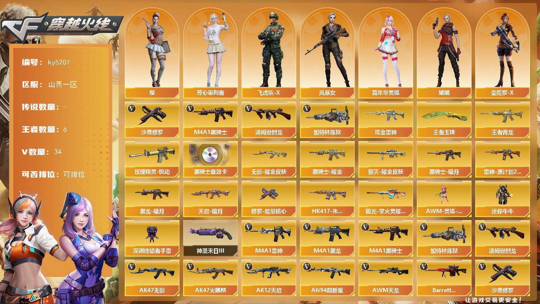 [16334298]山西一区-34V-6王者-1炫金 【热门武器】:M4A1-黑骑士*2,汤姆逊-烈龙,加特林-炼狱,沙鹰-修罗*3 【王者炫金武器】:玫瑰精灵-悦动,王者青龙,王者玉锋*2,炫金雷神 【音效卡】:M4A1-黑骑士音效卡 【皮肤】:雷神-源计划2.0专属 皮肤,毁灭耀金皮肤,黑龙-暗月,黑骑士-暗月,黑骑士耀金皮肤,无影耀金皮肤,天启-暗月,HK417-朱雀-掌火灵橙 皮肤,极光-掌火灵耀 皮肤,修罗-能量核心 【角色】:樱,芳心审判者,飞虎队-X,风暴女,嘉年华灵狐,娟娟,曼陀罗-X,潘多拉-甜心教官,潜龙队-X,蛇姬,雪莉杨,夜玫瑰-幻能朋克 【人偶武器】:AWM-灵狐-15周年嘉年华,迷你牛牛,深渊终结者手雷 【挑战大师】:神圣爆裂者-末日III 【英雄级武器】:M4A1-千变,AK47-火麒麟,M4A1-黑龙,M4A1-雷神,M4A1-黑骑士*2,AK47-无影,AK12-天启,AN94-超新星,无影-神兵利器,M4A1-猎神,王者火魄-觉醒版,AWM-天龙*2,Barrett-极光,王者之怒-觉醒版,加特林-炼狱,汤姆逊-烈龙,AA-12-雷霆,沙鹰-修罗*3,沙鹰-天神,屠龙*2,龙啸,擎天,麒麟刺 【道具】:冰冰企鹅背包,炫彩背包,绿色巨人,灵魂忍者,迷雾幽灵,生化弹匣,夺命之镰*2,防化服*3,金色流光-枪王排位*2,星辰流光-枪王排位,枪王排位29赛季金色流光,防弹头盔*5,防弹衣*5,C4工具钳*5,手雷包*4 【特殊枪械】:2黑骑士,1烈龙,1炼狱