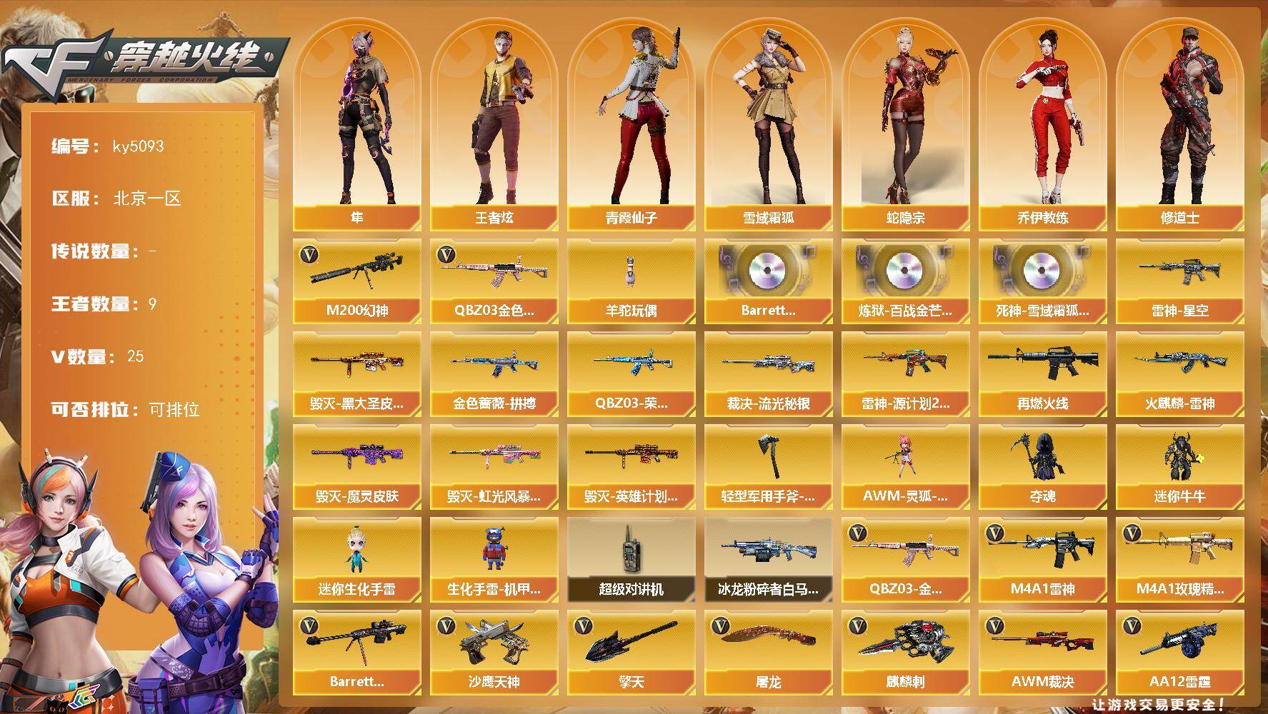 [16332519]北京一区-25V-9王者-0炫金 【热门武器】:QBZ03-金色蔷薇,M200-幻神,羊驼玩偶 【音效卡】:Barrett-碧霄极光音效卡,炼狱-百战金芒-庆典舞曲音效卡,死神-雪域霜狐-怀旧音效卡 【皮肤】:QBZ03-金色蔷薇-拼搏,QBZ03-荣耀世冠EP 皮肤,裁决-流光秘银,雷神-星空,雷神-源计划2.0专属 皮肤,M4A1-再燃火线,火麒麟-雷神,毁灭-黑大圣皮肤,毁灭-魔灵皮肤,毁灭-虹光风暴 皮肤,毁灭-英雄计划 皮肤,轻型军用手斧-再燃火线 【角色】:隼,王者炫,雪域霜狐,蛇隐宗,乔伊教练,修道士,初恋灵狐,电竞少女,芳心审判者,风暴女,嘉年华灵狐,娟娟,兰妹妹,0号玩家,灵狐者-X,龙儿,麻雀,曼陀罗-X,潘多拉-甜心教官,青霞仙子,蛇姬,铁骑-乘风破浪,夜玫瑰-宠粉 【人偶武器】:AWM-灵狐-15周年嘉年华,夺魂,迷你牛牛*2,迷你生化手雷,生化手雷-机甲核心 【暴走生化】:超级对讲机 【挑战大师】:冰龙粉碎者-白马银枪 【英雄级武器】:M4A1-雷神,AK47-机械迷城,死神-雪域霜狐,M4A1-玫瑰精灵,QBZ03-金色蔷薇,Barrett-毁灭,AWM-裁决,M200-幻神,炼狱-百战金芒,AA-12-雷霆,沙鹰-天神*2,屠龙*2,擎天,麒麟刺,麒麟刺-百战金芒,闪光弹-竞技荣光,闪光弹-雷霆王者-觉醒版*3,烟雾弹-古蛇迷踪,烟雾弹-雷霆王者-觉醒版*3,烟雾弹-荣耀世冠EP,M4A1-赤狱骑士,M4A1-苍鸣雷神,Barrett-碧霄极光 【道具】:BS战队炫彩背包,CFS限定背包,亚洲杯纪念炫彩背包,炫彩背包,百战金芒炫彩背包,超级背包,迷你冰龙背包,雪域霜狐炫彩背包,终极猎手-秦魂将军,女皇终结者-魔龙之吻,救世主-黑桃战神,绿色巨人,灵魂忍者,迷雾幽灵*2,生化弹匣,夺命之镰,防化服*3,巅峰赛先锋-金色流光,枪王排位28赛季金色流光,枪王排位29赛季金色流光,语音特效-盛典烟火,语音特效-怀旧,语音特效-机器人,雪域霜狐表情,蛇隐宗表情,萌萌小葵表情,防弹头盔*6,防弹衣*6,C4工具钳*6,手雷包*6 【特殊枪械】: