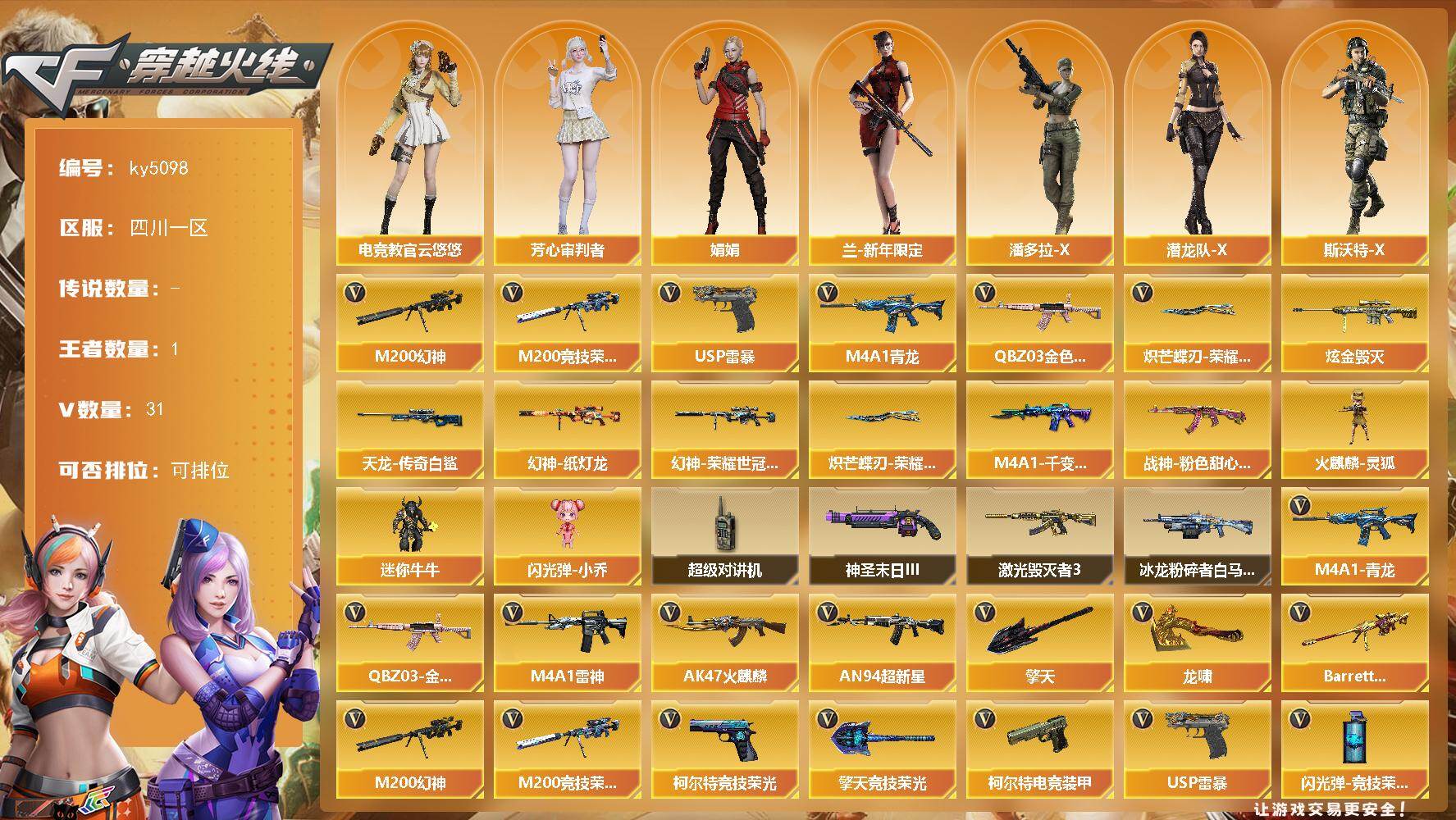 [16332597]四川一区-31V-1王者-1炫金 【热门武器】:QBZ03-金色蔷薇,M4A1-青龙,M200-幻神,M200-竞技荣光,USP-雷暴,炽芒蝶刃-荣耀世冠白鲨2023 皮肤 【王者炫金武器】:炫金毁灭 【皮肤】:幻神-纸灯龙皮肤,幻神-荣耀世冠白鲨2023 皮肤,M4A1-千变-孔明皮肤,战神-粉色甜心皮肤,AWM-天龙-传奇白鲨,炽芒蝶刃-荣耀世冠白鲨2023 皮肤 【角色】:电竞教官-云悠悠,芳心审判者,娟娟,兰-新年限定,潘多拉-X,潜龙队-X,斯沃特-X,影武者-X 【人偶武器】:火麒麟-灵狐,迷你牛牛,闪光弹-小乔 【暴走生化】:超级对讲机 【挑战大师】:冰龙粉碎者-白马银枪,激光毁灭者III,神圣爆裂者-末日III 【英雄级武器】:AK47-火麒麟,M4A1-雷神,AN94-超新星,M4A1-青龙,QBZ03-金色蔷薇,AK-47-猩红传说,AK47-B-战神,王者芳薇-觉醒版,M200-幻神,Barrett-朱雀,M200-竞技荣光,USP-雷暴,柯尔特-电竞装甲,柯尔特-竞技荣光,龙啸,擎天,擎天-竞技荣光,高爆手雷-竞技荣光*2,闪光弹-竞技荣光*3,烟雾弹-幻灵,烟雾弹-竞技荣光*3 【道具】:BS战队炫彩背包,云海游龙炫彩背包,亚洲杯纪念炫彩背包,超级背包,绿色巨人,灵魂忍者,迷雾幽灵,夺命之镰,防化服*2,金色流光-枪王排位*2,EP战队名片,防弹头盔*2,防弹衣*2,C4工具钳*2,手雷包*2 【特殊枪械】: