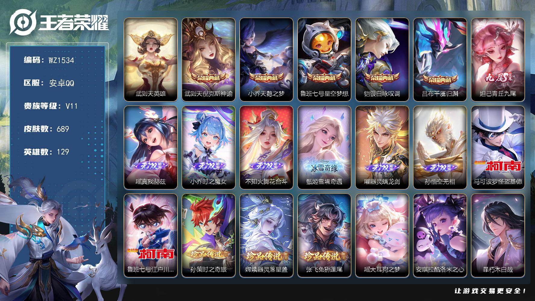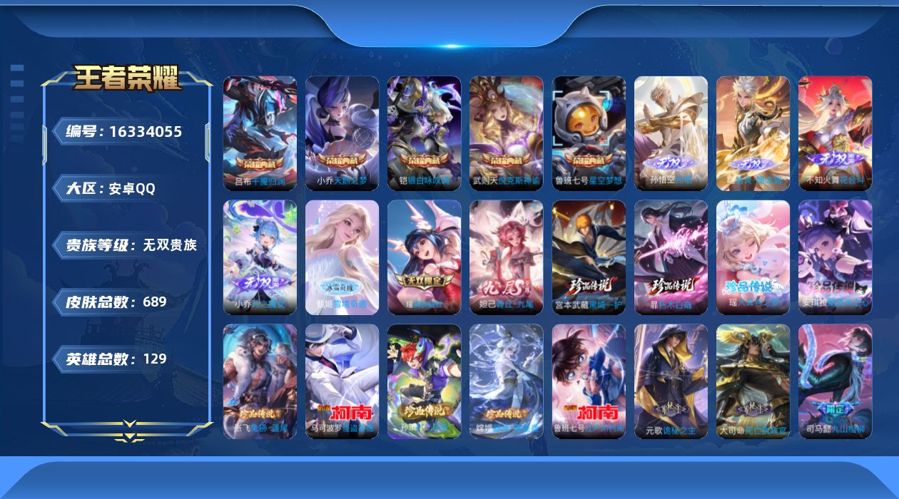 [16334055]安卓q 无双V10 689皮 全国前10%巅峰全能标 6水 7无双 满珍品 104传 金色灵宝 5天幕 无双:孙悟空-无相/曜-器灵·螭龙剑/瑶-真我赫兹/甄姬-雪境奇遇/不知火舞-花合斗/妲己-青丘·九尾/小乔-时之魔女 典藏:吕布-千魇归渊/铠-银白咏叹调/小乔-天鹅之梦/鲁班七号-星空梦想/武则天-倪克斯神谕/武则天-武则天含包赔 7888