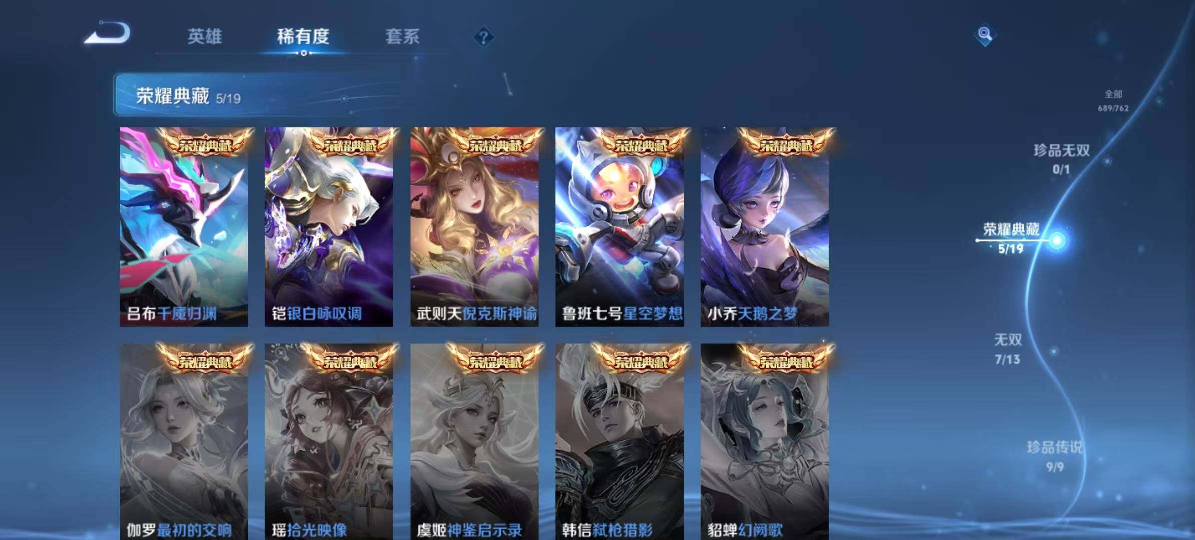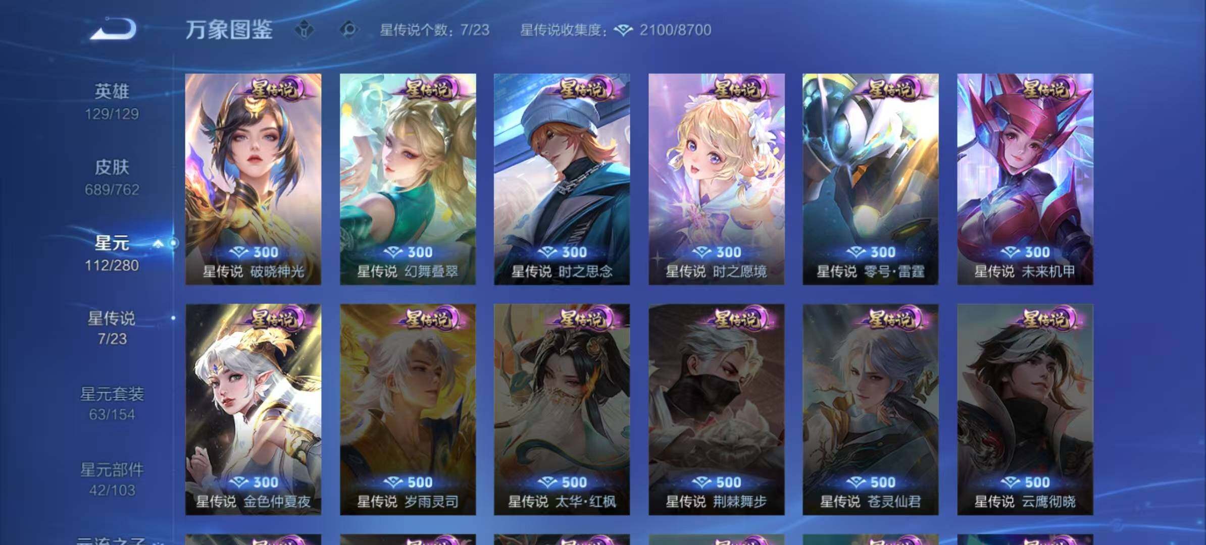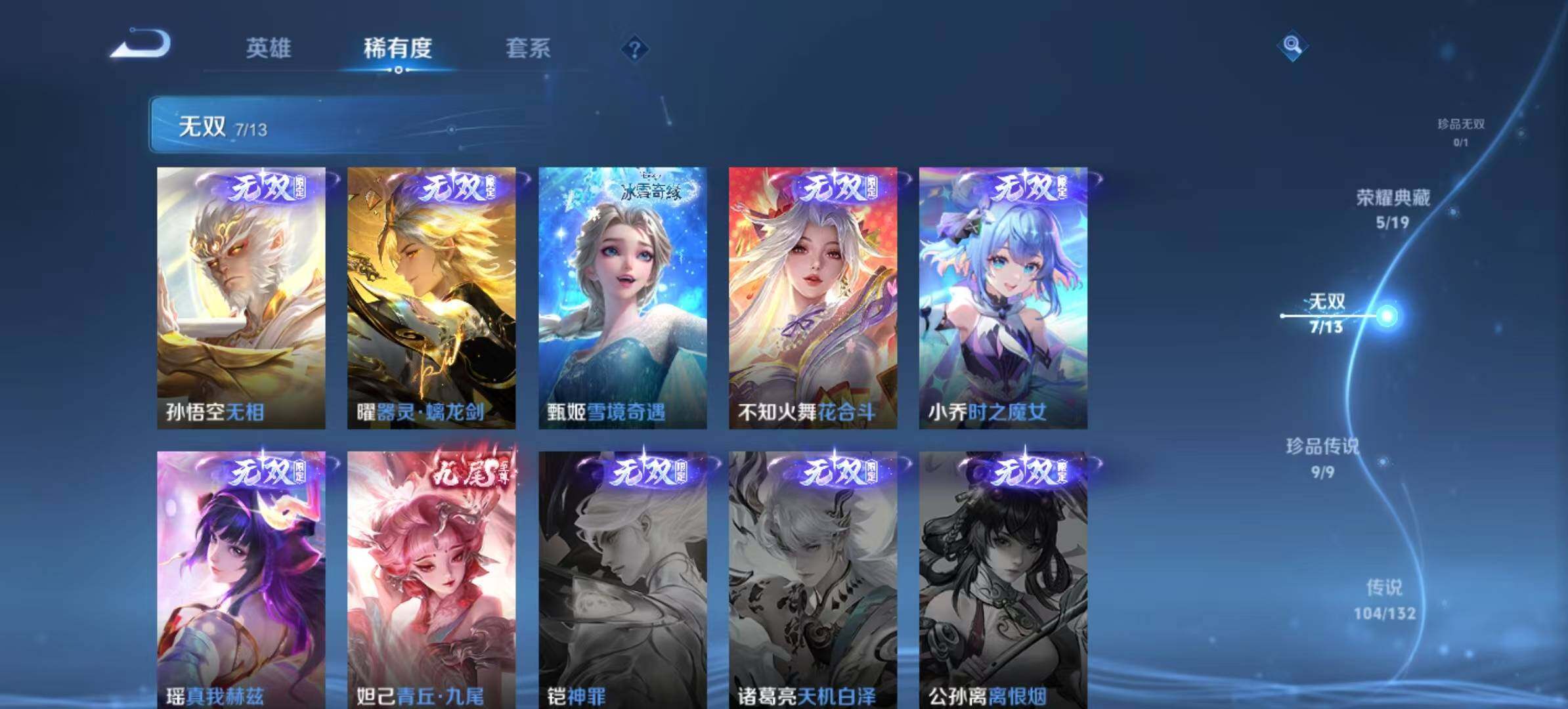 关羽冰锋战神,裴擒虎李小龙,上官婉儿梁祝,牛魔奔雷神使,貂蝉逐梦之音,公孙离祈雪灵祝,吕布御风骁将,诸葛亮时雨天司,赵云龙胆,关羽武圣,黄忠烈魂,张飞虎魄,马超神威,后羿辉光之辰,庄周玄嵩,典韦岱宗,甄姬幽恒,韩信飞衡,伽罗太华,曹操天狼征服者,裴擒虎天狼狩猎者,孙膑天狼运算者,上官婉儿天狼绘梦者,伽罗天狼溯光者,哪吒逐梦之翼,马可波罗逐梦之星,韩信逐梦之影,东皇太一逐梦之光,铠青龙志,百里玄策白虎志,花木兰瑞麟志,苏烈玄武志,百里守约朱雀志,王昭君凤凰于飞,项羽霸王别姬,虞姬霸王别姬,小乔纯白花嫁,周瑜真爱至上,孙悟空大圣娶亲,露娜一生所爱,花木兰默契交锋,兰陵王默契交锋,后羿如梦令,嫦娥如梦令,孙悟空至尊宝,裴擒虎梅西,雅典娜神奇女侠,妲己热情桑巴,干将莫邪冰霜恋舞曲,花木兰青春决赛季,蔡文姬奇迹圣诞,妲己时之彼端,公孙离蜜橘之夏,芈月白晶晶,安琪拉魔法小厨娘,赵云引擎之心,孙悟空美猴王,庄周云端筑梦师,鲁班七号乒乒小将,大乔白鹤梁神女,猪八戒猪悟能,廉颇寅虎·御盾,孙尚香异界灵契,老夫子圣诞老人,孙悟空孙行者,甄姬女儿国国王,镜匿光追影者,韩信傲雪梅枪,孙膑寅虎·展翼,杨玉环寅虎·心曲,裴擒虎寅虎·赤拳,云中君时之祈愿,瑶时之祈愿,女娲补天,赵云百木心枪,公孙离玉兔公主,露娜启示之音,夏侯惇匿光决锋者,后羿无尽星芒,金蝉唐三藏,娜可露露前尘镜,橘右京枫霜尽,鲁班大师匿光启智者,王昭君星穹之声,不知火舞绯月行,上官婉儿神器·万象笔,盾山梦圆繁星,墨子降魔,马可波罗山海·玄木吟,盘古冰霜神祇,瑶山海·碧波行,兰陵王影龙天霄,西施至美·乘鲤谣,甄姬至美·化雀舞,夏侯惇霜北刀,桑启鸣野蒿,艾琳陌上桑,王昭君映山客,澜愿照·九州拓,蔡文姬愿照·福禄聚,虞姬愿照·岁时盈,司空震愿照·山河定,妲己愿照·众生和,女娲愿照·千秋盛