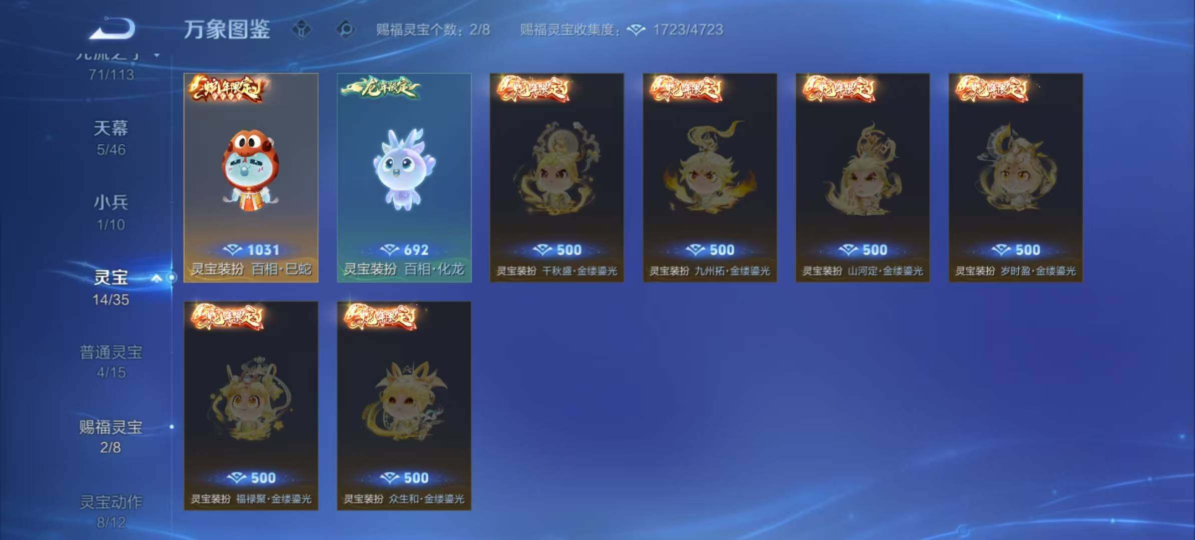 达摩黄金狮子座,张良黄金白羊座,干将莫邪久胜战神,铠绛天战甲,貂蝉猫影幻舞,镜炽阳神光,西施游龙清影,虞姬云霓雀翎,李信一念神魔,赵云淬星耀世,周瑜音你心动,刘备时之恋人,孙悟空零号·赤焰,曜李逍遥,孙策挚爱之约,大乔挚爱花嫁,百里守约碎云,狄仁杰神器·狴犴令,干将莫邪画中仙,夏洛特浮生妄,公孙离记忆之芯,张飞百相守梦,安琪拉追逃游戏,亚瑟追逃游戏,宫本武藏惊梅引,吕布遇见神鼓,大乔时之奇旅,鲁班七号时之奇旅,艾琳觅芳踪,澜逐花归海,孙策乘龙·淬吴钩,赵云乘龙·铭钟鼎,孙尚香乘龙·问璇玑,吕布曦玄引,貂蝉曦玄引,亚连落雪白狼,海月金乌负日,墨子黄金天蝎座,云中君群星魔术团,朵莉亚心动手记,铠冥王哈迪斯,嬴政玄雷天君,裴擒虎祥瑞亨通,云缨幻光神枪,后羿千劫归真,杨玉环星之鸣奏,西施续相思
